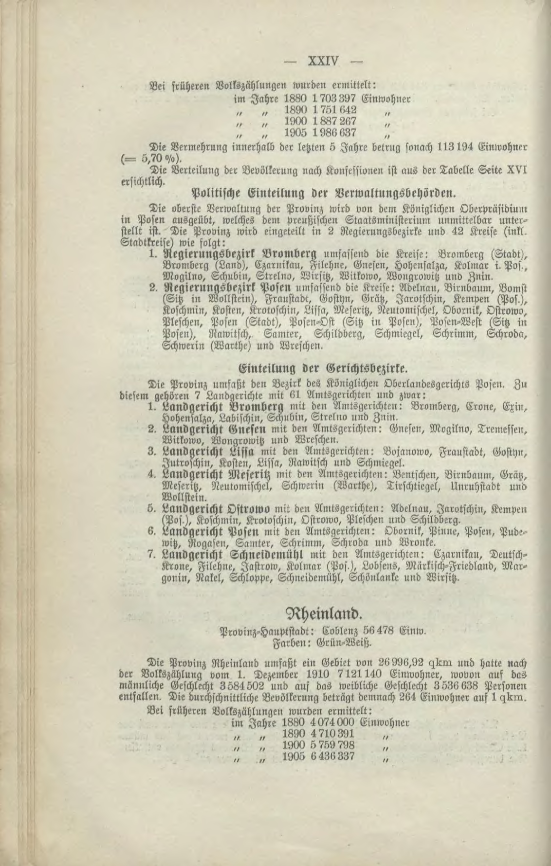 Die Provinz umfaßt den Bezirk des Königlichen Oberlandesgerichts Posen. Zu diesem gehören 7 Landgerichte mit 61 Amtsgerichten und zwar: