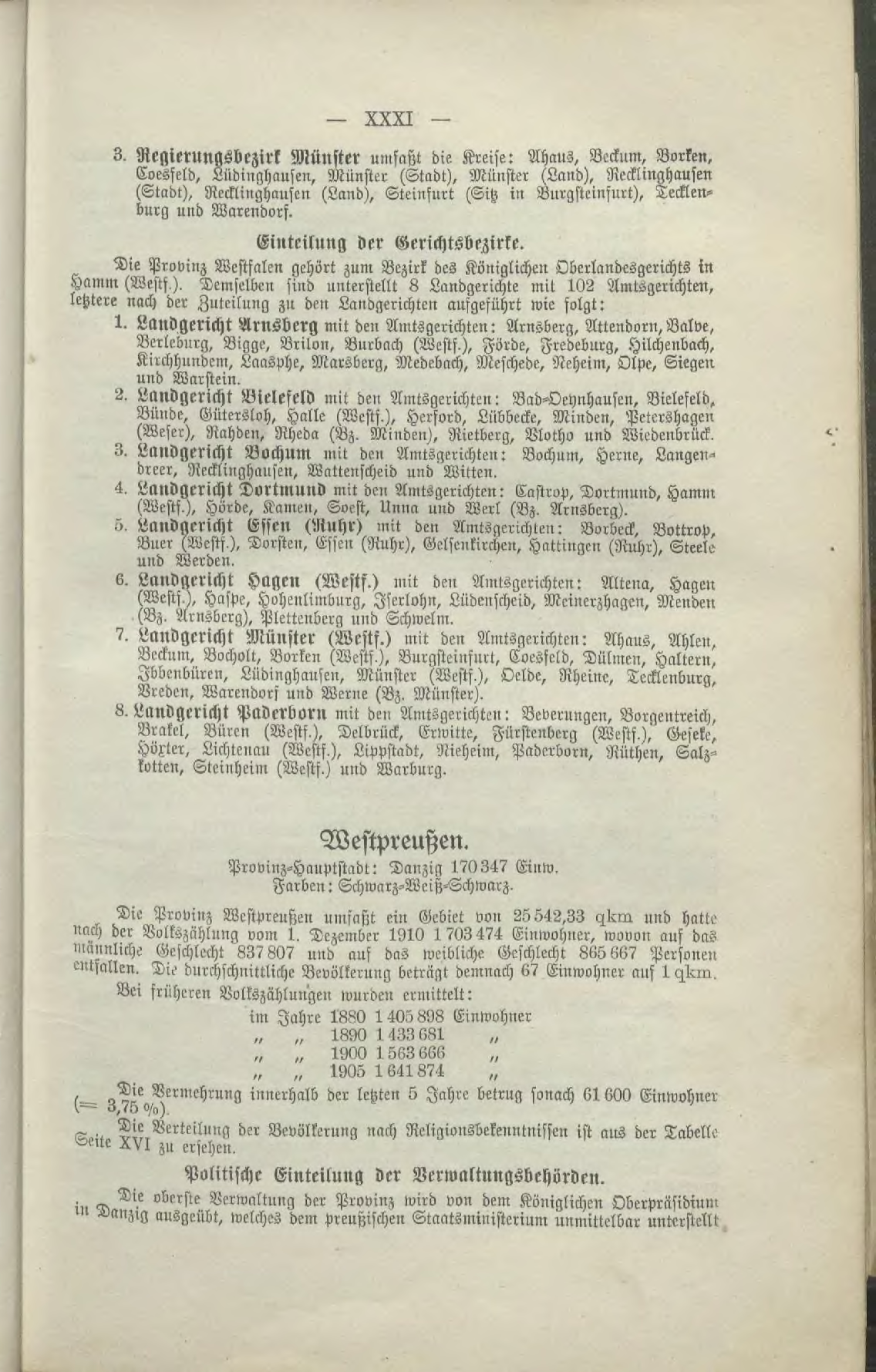 Die Provinz Westfalen gehört zum Bezirk des Königlichen Oberlandesgerichts in Hamm (Westf.). Demselben sind unterstellt 8 Landgerichte mit 102 Amtsgerichten, letztere nach der Zuteilung zu den Landgerichten ausgeführt wie folgt:
