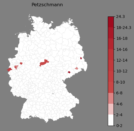 Relative Verteilung des Namens Petzschmann (1996)Direkt zur Karte Die Farbskala zeigt die Anzahl von "Petzschmann" bezogen auf je 1 Million Einträge. |