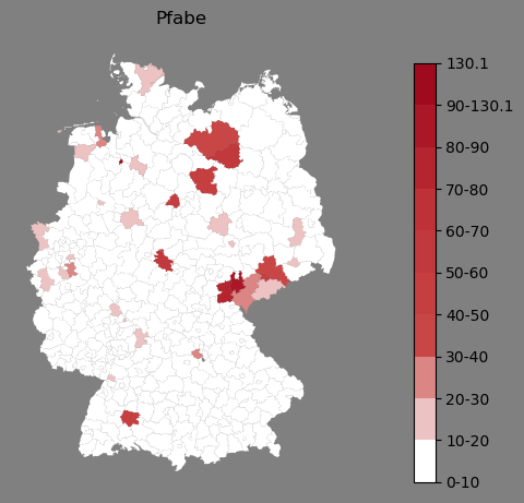 Relative Verteilung des Namens Pfabe (1996)Direkt zur Karte Die Farbskala zeigt die Anzahl von "Pfabe" bezogen auf je 1 Million Einträge. |