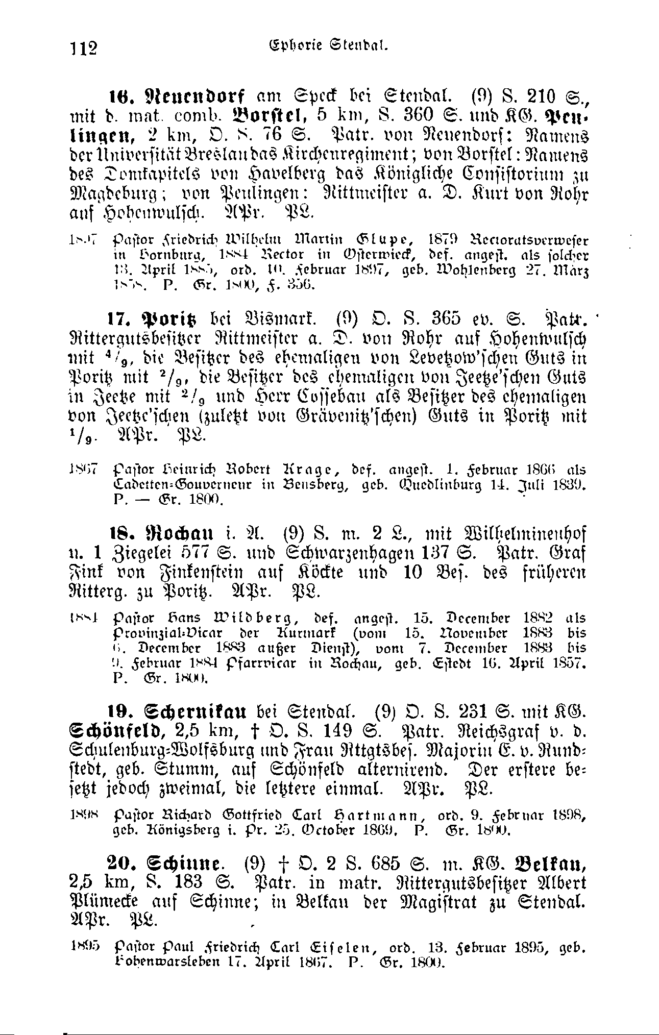 Neuendorf am Speck bei Stendal, Altmärkisch-Priegnitzsches Gesangbuch, Schule, 210 Seelen, mit der mater combinata Borstel, 5 km, Schule, 360 Seelen, und Kirchengemeinde Peulingen, 2 km, Orgel, Schule, 76 Seelen, Patron von Neuendorf: Namens der Universität Breslau das Kirchenregiment; von Borstel: Namens des Domkapitels von Havelberg das Königliche Consistorium zu Magdeburg; von Peulingen: Rittmeister a. D. Kurt von Rohr auf Hohenwulsch. Kirchenordnung: Altmärkisch Preußisches Recht. Patronat defectu aerarii Lasten tragend.