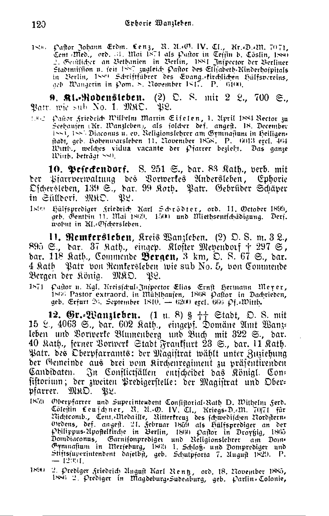 | 1902 | Pastor Friedrich Wilhelm Martin Eiselen, 1. April 1884 Rector zu Seehausen, Kreis Wanzleben, als solcher definitiv angestellt 18. December 1884, 1885 Diaconus und evangelischer Religionslehrer am Gymnasium in Heiligenstadt, geboren Hohenwarsleben 11. November 1858. Stelleninhaber gehört dem Pensionsfonds an. Grundgehalt 6.013 Mark exclusive 464 Mark Witthum, welches vidua vacante der Pfarrer bezieht. Das ganze Witthum beträgt 880 Mark. |