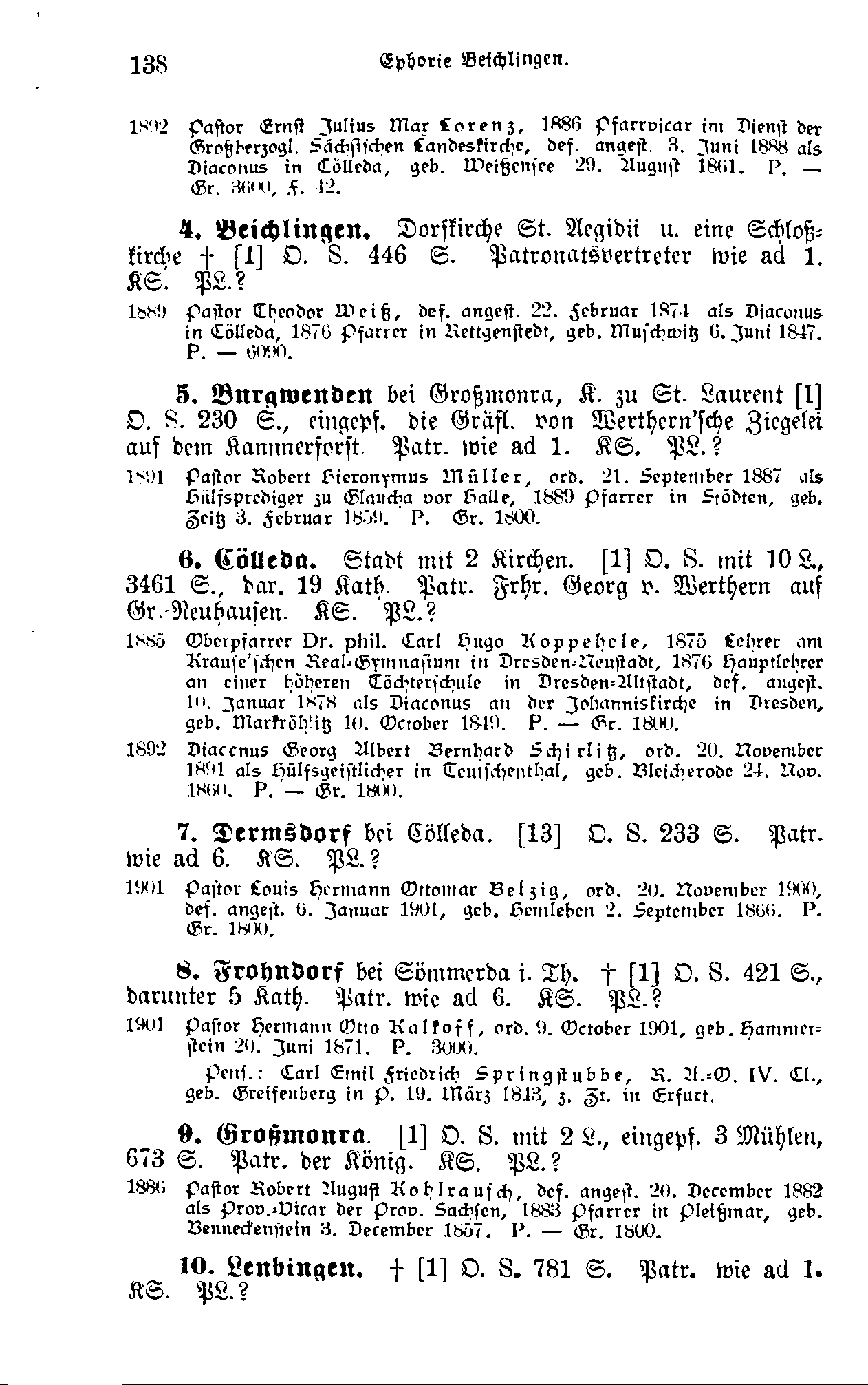 Cölleda, Stadt mit zwei Kirchen, Provinzial-Gesangbuch, Orgel, Schule mit 10 Lehrern, 3.461 Seelen, darunter 19 Katholiken. Patron Freiherr Georg v. Werthern auf Groß-Neuhausen. Kirchenordnung: Kursachsen. Die patronatische Lastenpflicht ist zu verneinen, oder zweifelhaft, oder noch unerörtert.