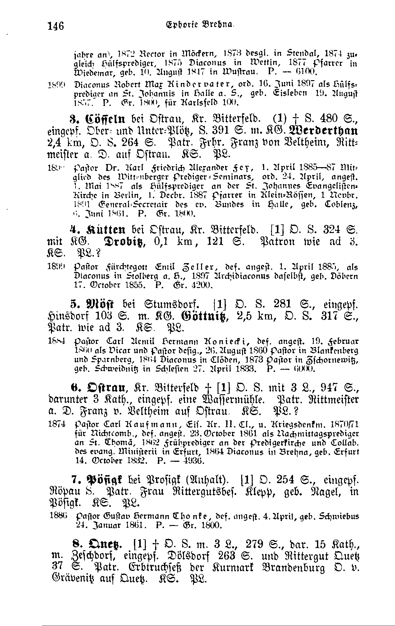 Cösseln bei Ostrau, Kreis Bitterfeld, Provinzial-Gesangbuch, Rittergut, Schule, 480 Seelen, eingepfarrt Ober- und Unter-Plötz, Schule, 391 Seelen, mit Kirchengemeinde Werderthau, 2,4 km, Orgel, Schule, 264 Seelen. Patron Freiherrr Franz von Veltheim, Rittmeister a. D. auf Ostrau. Kirchenordnung: Kursachsen. Patronat defectu aerarii Lasten tragend.
