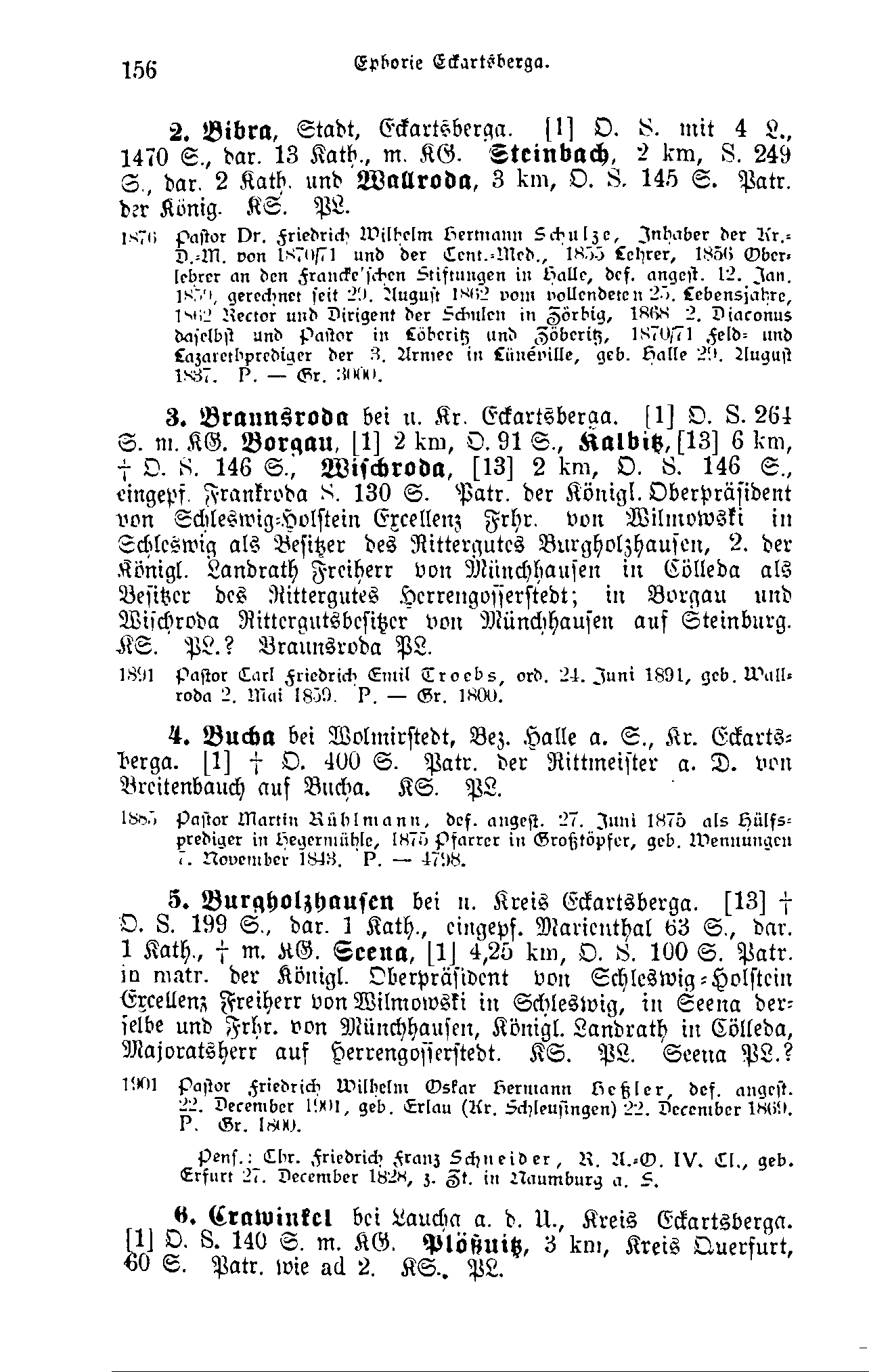 Braunsroda bei und Kreis Eckartsberga, Provinzial-Gesangbuch, Orgel, Schule, 264 Seelen, mit Kirchgemeinde Borgau, Provinzial-Gesangbuch, 2 km, Orgel, 91 Seelen, Kalbitz, Neues Dresdener Gesangbuch, 6 km, Rittergut, Orgel, Schule, 146 Seelen, Wischroda, Neues Dresdener Gesangbuch, 2 km, Orgel, Schule, 146 Seelen, eingepfarrt Frankroda, Schule, 130 Seelen. Patron: 1. der Königliche Oberpräsident von Schleswig-Holstein Excellenz Freiherr von Wilmowski in Schleswig als Besitzer des Rittergutes Burgholzhausen, 2. der Königliche Landrath Freiherr von Münchhausen in Cölleda als Besitzer des Rittergutes Herrengosserstedt; in Borgau und Wischroda Rittergutsbesitzer von Münchhausen auf Steinburg. Kirchenordnung: Kursachsen. Die patronatische Lastenpflicht ist zu verneinen, oder zweifelhaft, oder noch unerörtert. Braunsroda Patronat defectu aerarii Lasten tragend.