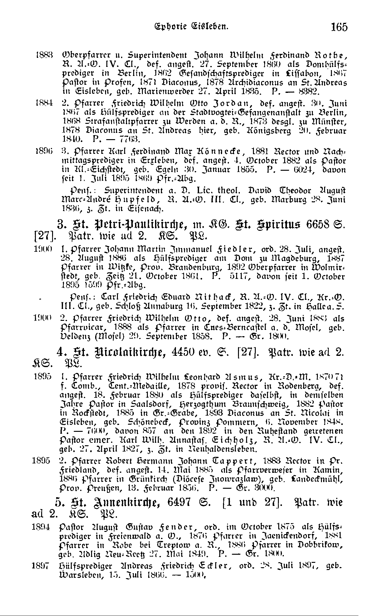 | 1883 | Oberpfarrer und Superintendent Johann Wilhelm Ferdinand Rothe, Rother Adler-Orden IV. Classe, definitiv angestellt 27. September 1860 als Domhülfsprediger in Berlin, 1862 Gesandschaftsprediger in Lissabon, 1867 Pastor in Profen, 1871 Diaconus, 1878 Archidiaconus an St. Andreas in Eisleben, geboren Marienwerder 27. April 1835. Stelleninhaber gehört dem Pensionsfonds an. - Grundgehalt 8.382 Mark. |