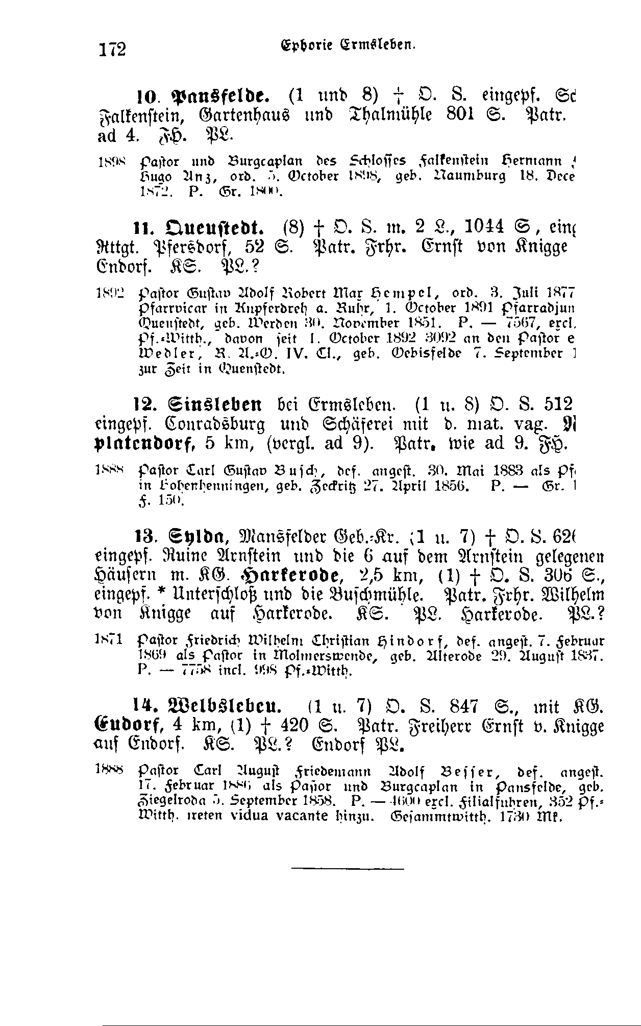 Welbsleben, Provinzial-Gesangbuch und Altes Halberstädter Gesangbuch, Orgel, Schule, 847 Seelen, mit Kirchengemeinde Endorf, 4 km, Provinzial-Gesangbuch, Rittergut, 420 Seelen. Patron Freiherr Ernst v. Knigge auf Endorf. Kirchenordnung: Kursachsen. Die patronatische Lastenpflicht ist zu verneinen, oder zweifelhaft, oder noch unerörtert. Endorf Patronat defectu aerarii Lasten tragend.