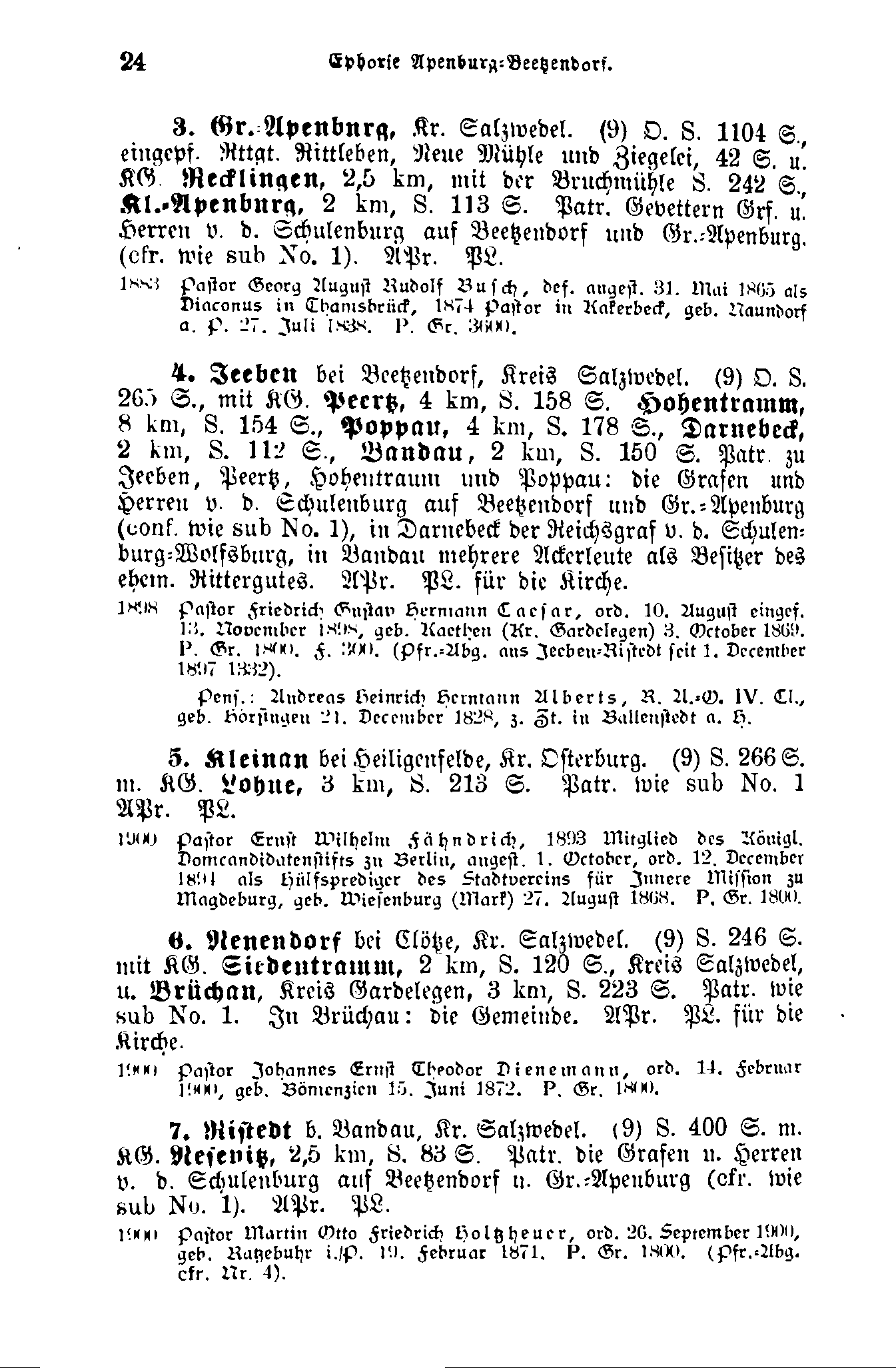 Groß-Apenburg, Kreis Salzwedel, Altmärkisch-Priegnitzsches Gesangbuch, Orgel, Schule, 1.104 Seelen, eingepfarrt Rittergut Rittleben, Neue Mühle und Ziegelei, 42 Seelen, und Kirchengemeinden Recklingen, 2,5 km, mit der Bruchmühle, Schule, 242 Seelen, Klein-Apenburg, 2 km, Schule, 113 Seelen. Patron Gevettern Grafen und Herren v. d. Schulenburg auf Beetzendorf und Groß-Apenburg. (cfr. wie sub No. 1). Kirchenordnung: Altmärkisch Preußisches Recht. Patronat defectu aerarii Lasten tragend.