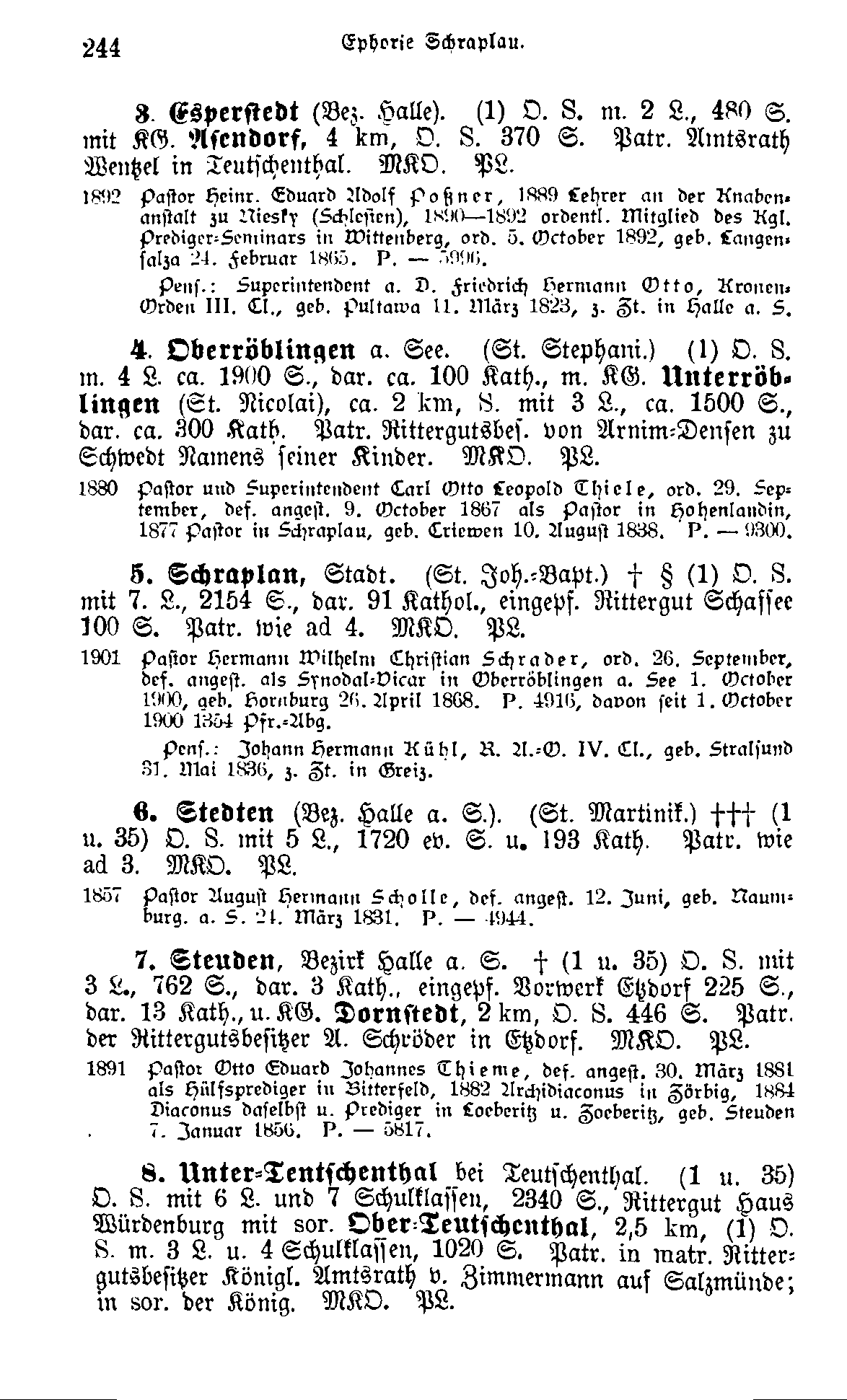 | 1880 | Pastor und Superintendent Carl Otto Leopold Thiele, ordinirt 29. September, definitiv angestellt 9. October 1867 als Pastor in Hohenlaudin, 1877 Pastor in Schraplau, geboren Criewen 10. August 1838. Stelleninhaber gehört dem Pensionsfonds an. - Grundgehalt 9.300 Mark. |