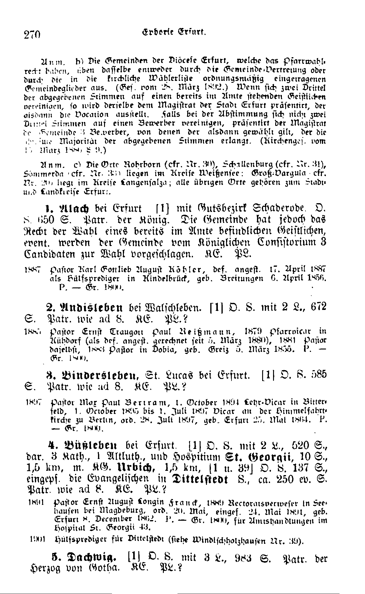 Alach bei Erfurt, Provinzial-Gesangbuch, mit Gutsbezirk Schaderode, Orgel, Schule, 650 Seelen. Patron der König. Die Gemeinde hat jedoch das Recht der Wahl eines bereits im Amte befindlichen Geistlichen, eventuell werden der Gemeinde vom Königlichen Consistorium drei Candidaten zur Wahl vorgeschlagen. Kirchenordnung: Kurmainzisches Gebiet Erfurt. Patronat defectu aerarii Lasten tragend.