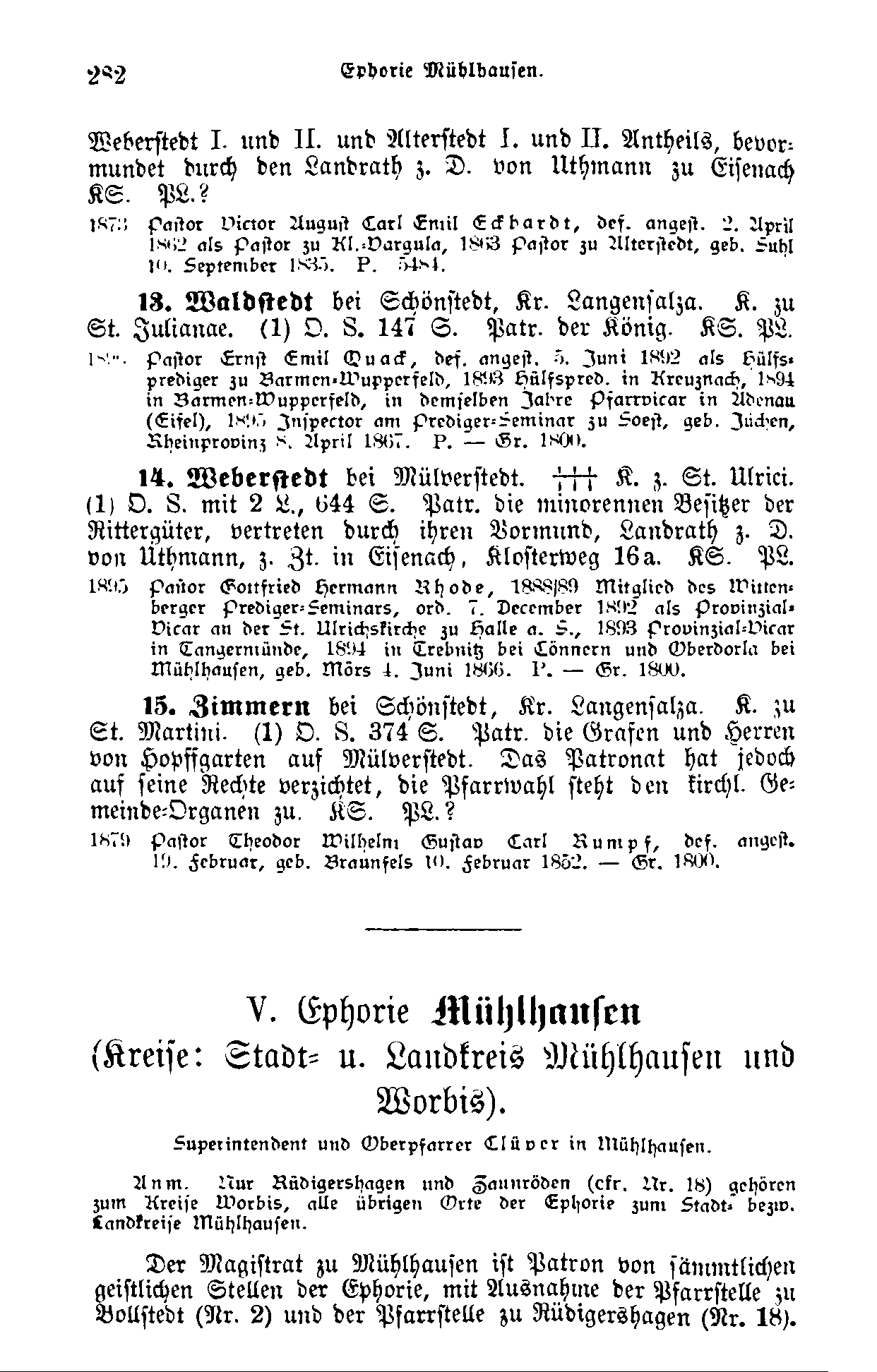 Weberstedt bei Mülverstedt, drei Rittergüter, Kirche zu St. Ulrici, Provinzial-Gesangbuch, Orgel, Schule mit zwei Lehrern, 644 Seelen. Patron die minorennen Besitzer der Rittergüter, vertreten durch ihren Vormund, Landrath z. D. von Uthmann, zur Zeit in Eisenach, Klosterweg 16a. Kirchenordnung: Kursachsen. Patronat defectu aerarii Lasten tragend.