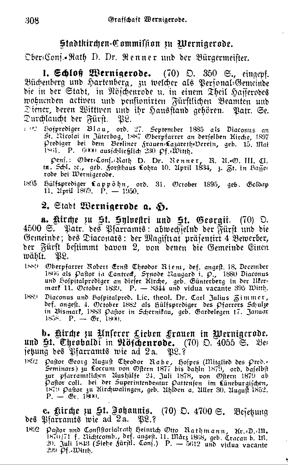| 1892 | Pastor und Conststorialrath Heinrich Otto Rathmann, Kriegsdenkmünze 1870/71 für Nichtcombattanten, definitiv angestellt 11. März 1868, geboren Cracau bei Magdeburg 20. Juli 1843 (siehe Fürstliches Consistorium). Stelleninhaber gehört dem Pensionsfonds an. - Grundgehalt 5.612 Mark und vidua vacante 299 Mark Pfarr-Witthum. |