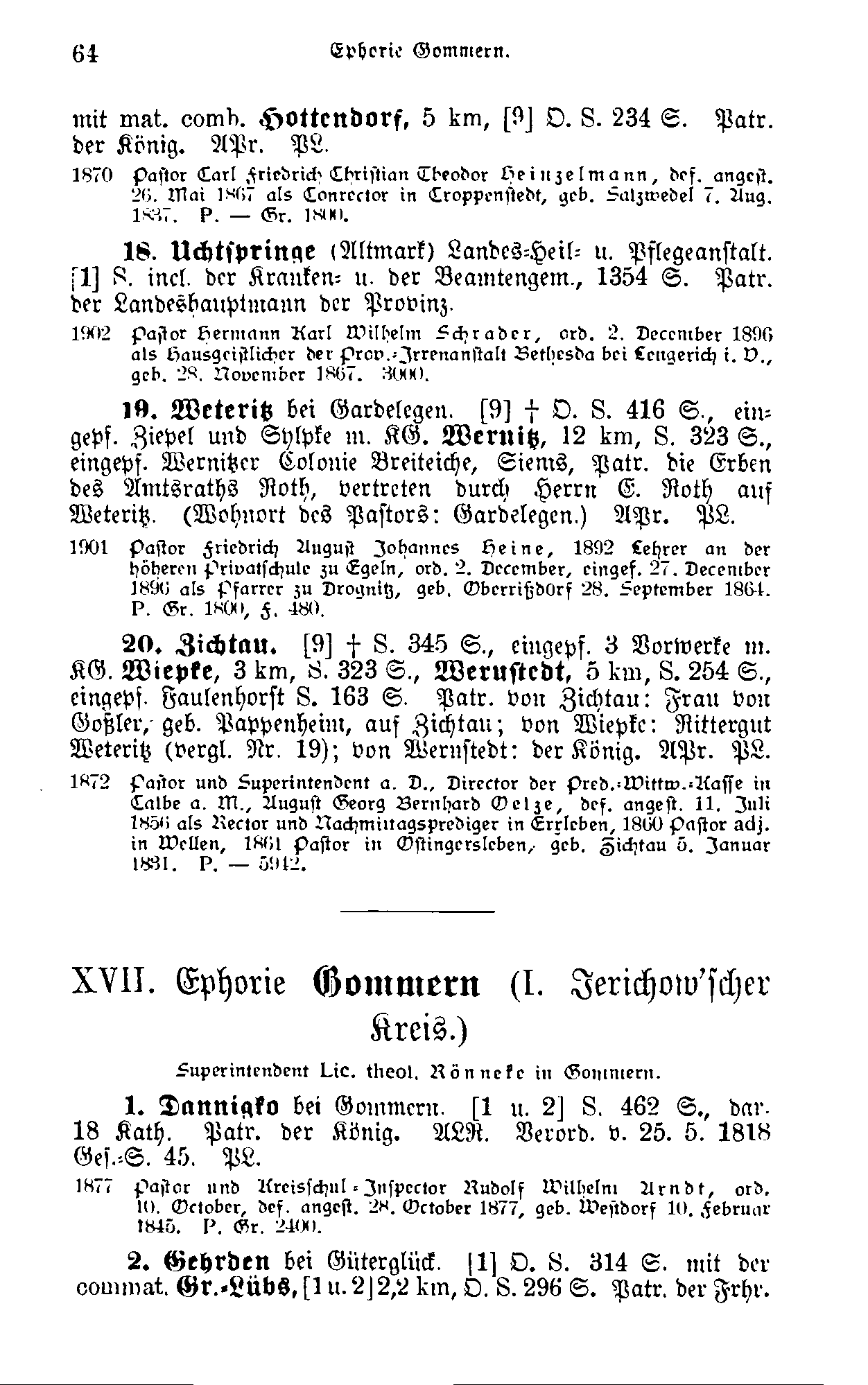Weteritz bei Gardelegen, Altmärkisch-Priegnitzsches Gesangbuch, Rittergut, Orgel, Schule, 416 Seelen, eingepfarrt Ziepel und Sylpke mit Kirchengemeinde Wernitz, 12 km, Schule, 323 Seelen, eingepfarrt Wernitzer Colonie Breiteiche, Siems. Patron die Erben des Amtsraths Roth, vertreten durch Herrn E. Roth auf Weteritz. (Wohnort des Pastors: Gardelegen). Kirchenordnung: Altmärkisch Preußisches Recht. Patronat defectu aerarii Lasten tragend.