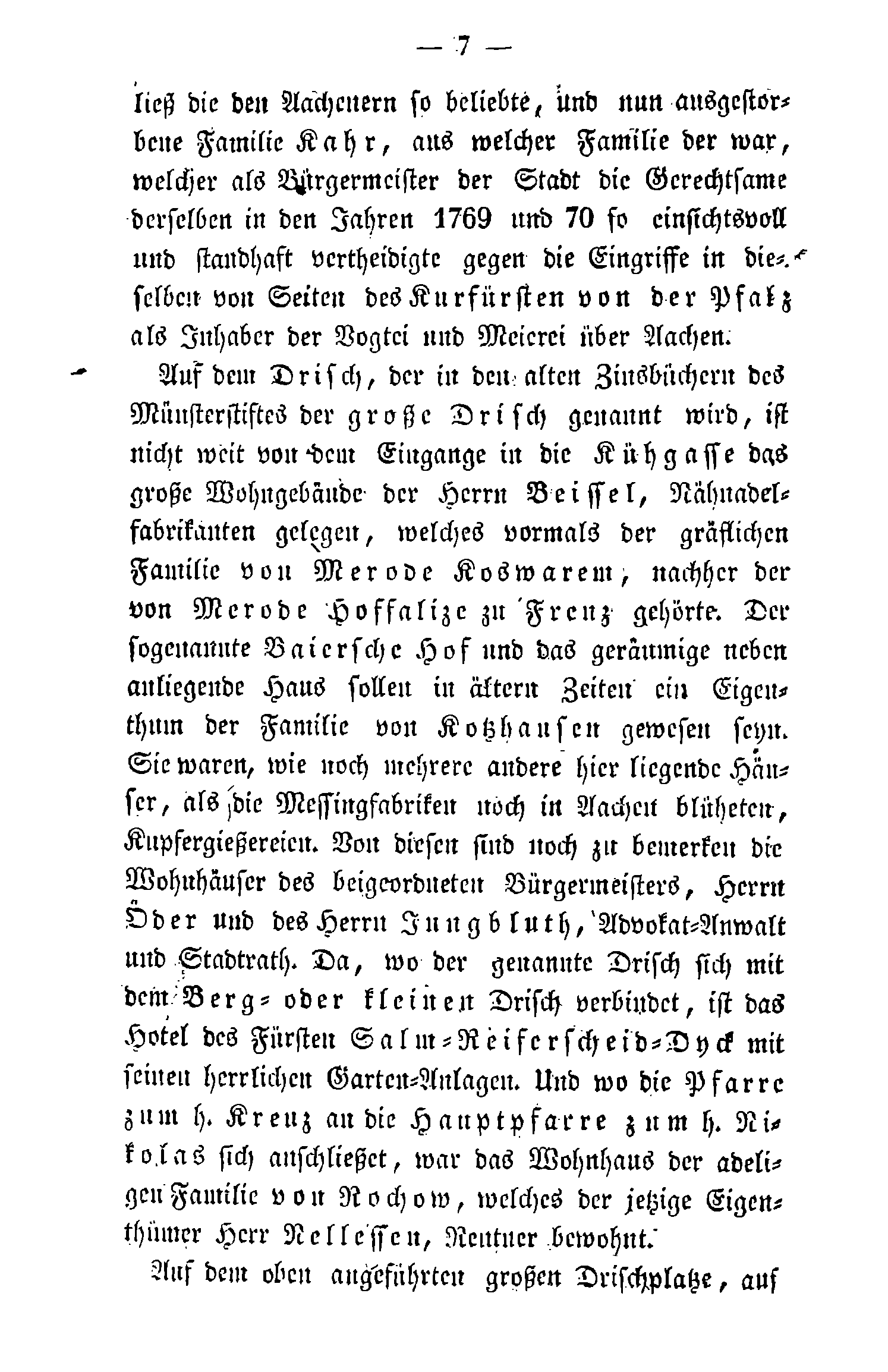 Auf dem Drisch, der in den alten Zinsbüchern des Münsterstiftes der große Drisch genannt wird, ist nicht weit von dem Eingange in die Kuhgasse das große Wohngebäude der Herrn Beissel, Nähnadelfabrikanten gelegen, welches vormals derb gräflichen Familie von Merode Koswarem, nachher der von Merode Hoffalize zu Frenz gehörte. Der sogenannte Baiersche Hof und das geräumige neben anliegende Haus sollen in ältern Zeiten ein Eigenthum der Familie von Kotzhausen gewesen seyn. Sie waren, wie noch mehrere andere hier liegende Häuser, als die Messingfabriken noch in Aachen blüheten, Kupfergießereien. Von diesen sind noch zu bemerken die Wohnhäuser des beigeordneten Bürgermeisters, Herrn Öder und des Herrn Jungbluth, Advokat-Anwalt und Stadtrath. Da, wo der genannte Drisch sich mit dem Berg- oder kleinen Drisch verbindet, ist das Hotel des Fürsten Salm-Reiferscheid-Dyck mit seinen herrlichen Garten-Anlagen. Und wo die Pfarre zum h. Kreuz an die Hauptpfarre zum h. Nikolas sich anschließet, war das Wohnhaus der adeligen Familie von Rochow, welches der jetzige Eigenthümer Herr Nellessen, Rentner bewohnt.