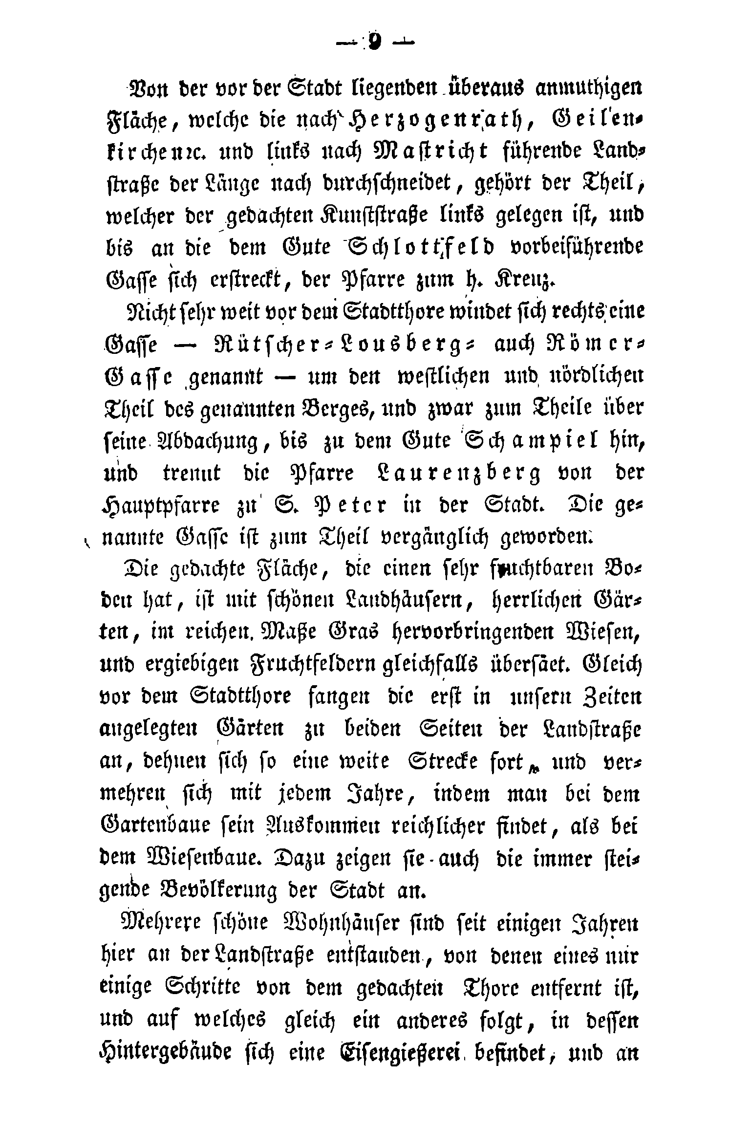 Von der vor der Stadt liegenden überaus anmuthigen Fläche, welche die nach Herzogenrath, Geilenkirchen etc. und links nach Mastricht führende Landstraße der Länge nach durchschneidet, gehört der Theil, welcher der gedachten Kunststraße links gelegen ist, und bis an die dem Gute Schlottfeld vorbeiführende Gasse sich erstreckt, der Pfarre zum h. Kreuz.