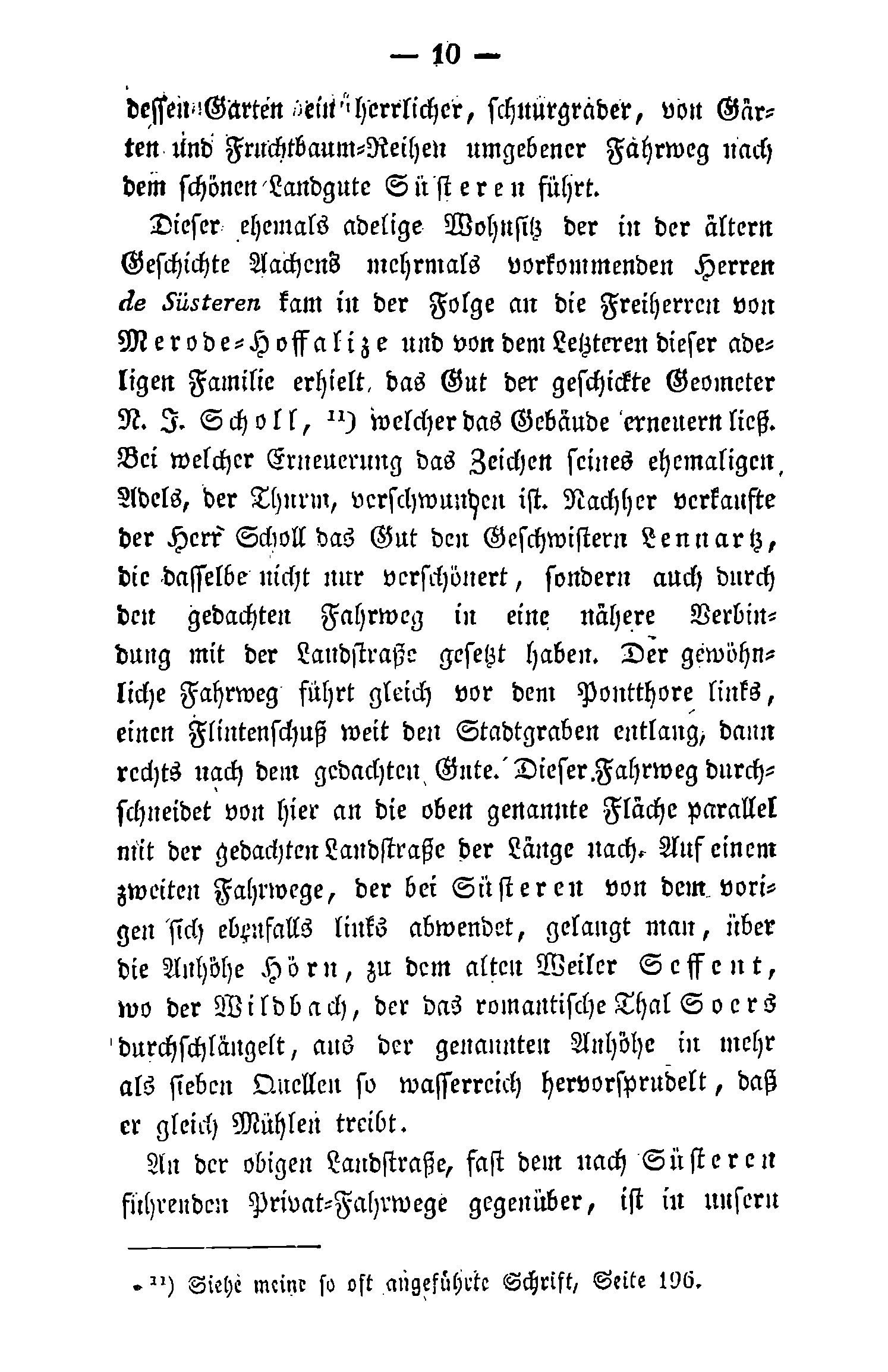 Dieser ehemals adelige Wohnsitz der in der älteren Geschichte Aachens mehrmals vorkommenden Herren de Süsteren kam in der Folge an die Freiherren von Merode-Hoffalize und von dem Letzteren dieser adeligen Familie erhielt das Gut der geschickte Geometer N. J. Scholl,[1] welcher das Gebäude erneuern ließ. Bei welcher Erneuerung das Zeichen seines ehemaligen Adels, der Thurm, verschwunden ist. Nachher verkaufte der Herr Scholl das Gut den Geschwistern Lennartz, die dasselbe nicht nur verschönert, sondern auch durch den gedachten Fahrweg in eine nähere Verbindung mit der Landstraße gesetzt haben. Der gewöhnliche Fahrweg führt gleich vor dem Pontthore links, einen Flintenschuß weit den Stadtgraben entlang, dann rechts nach dem gedachten Gute. Dieser Fahrweg durchschneidet von hier an die oben genannte Fläche parallel mit der gedachten Landstraße der Länge nach. Auf einem zweiten Fahrwege, der bei Süsteren von dem vorigen sich ebenfalls links abwendet, gelangt man, über die Anhöhe Hörn, zu dem alten Weiler Seffent, wo der Wildbach, der das romantische Thal Soers durchschlängelt, aus der genannten Anhöhe in mehr als sieben Quellen so wasserreich hervorsprudelt, daß er gleich Mühlen treibt.