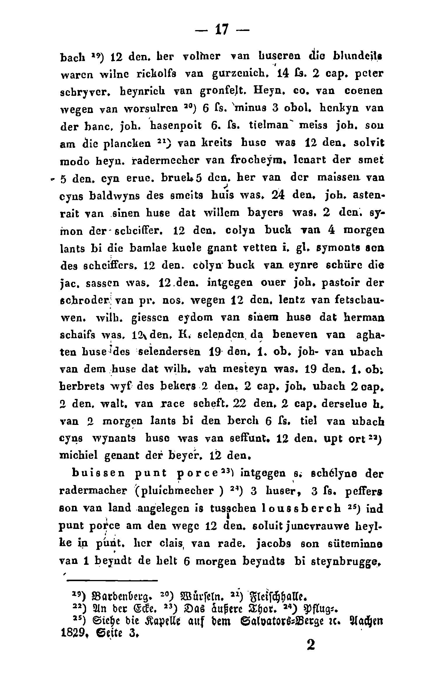 bussen punt porce[4] intgegen s. schelyne der radermacher (pluichmecher)[5] 3 huser, 3 ss. peffers son van land angelegen is tusschen loussberch[6] ind punt porc am dem wege 12 den. soluit juncvrauwe heylke in punt. her clais van rade. jacobs son süteminne van 1 beynt de helt 6 morgen beyndts bi steynbrugge.