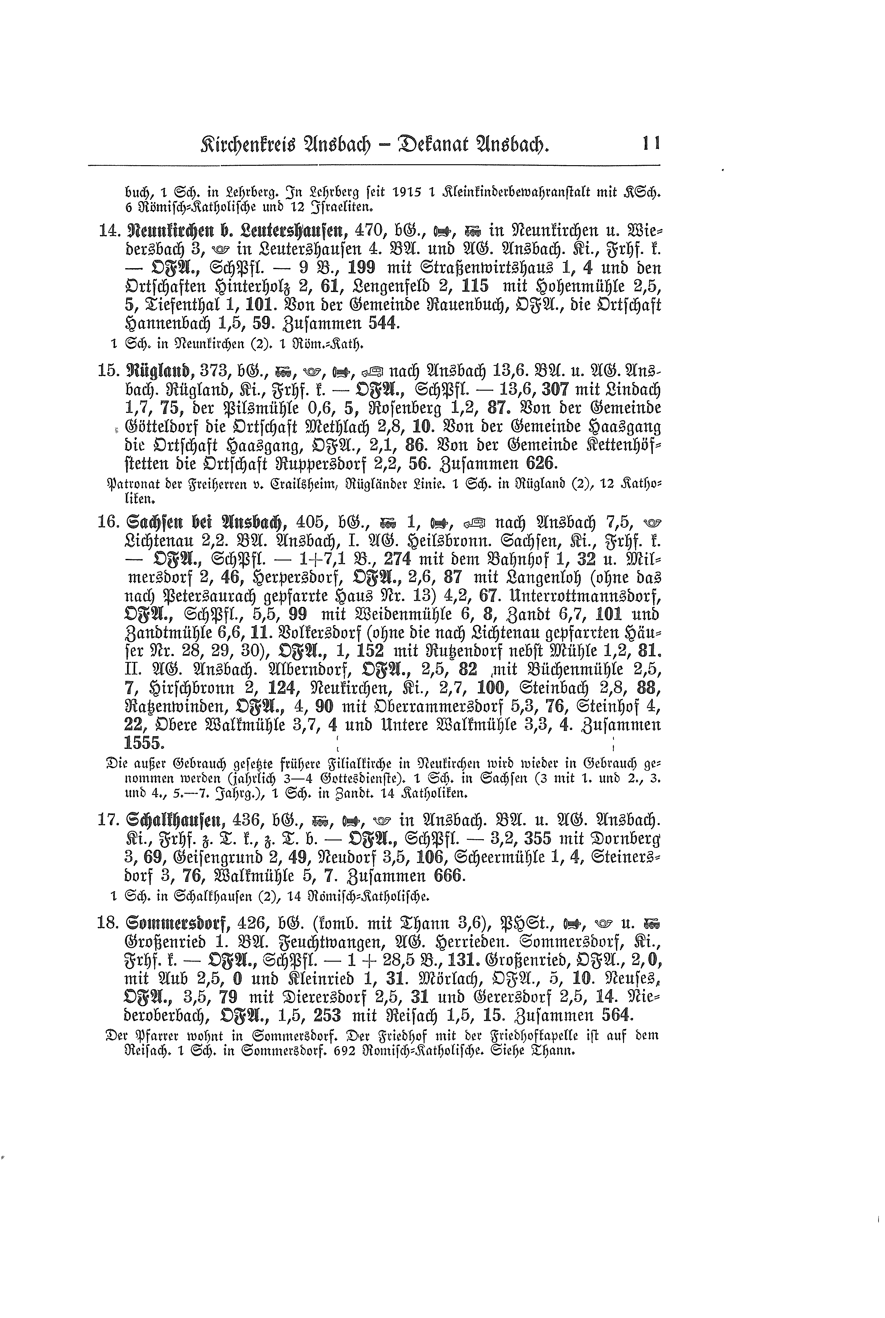 442 m, bürgerliche Gemeinde, Post, Telefon, Bahn in Bechhofen 2,5 km, Bus nach Bechhofen 2,5 km, Dinkelsbühl 20 km, Feuchtwangen 20 km. A. Bezirksamt Dinkelsbühl, Amtsgericht Wassertrüdingen. Königshofen, Kirche, Friedhof konfessionell evangelisch - Ortsfürsorgeausschuß (Pfarrer Vorsitz), Schulpflegschaft - 2,5 km + 33 Bahnkilometer, 353 Seelen, mit Oberkönigshofen 1,5 km, 19 Seelen und der Weihermühle 0,8 km, 5 Seelen, von der Gemeinde Beyerberg, Ortsfürsorgeausschuß, der Ort Kaltengreuth 2,5 km, 13 Seelen, Heinersdorf, Ortsfürsorgeausschuß, 3,8 km, 83 Seelen mit Birkach 2 km, 65 Seelen, Fröschau 3,6 km, 64 Seelen, Röttenbach 2,9 km, 21 Seelen, Rottnersdorf 1,8 km, 7 Seelen. B. Bezirksamt Feuchtwangen, Amtsgericht Herrieden: Arberg 7,5 km, 2 Seelen, Waizendorf, Ortsfürsorgeausschuß (Pfarrer Vorsitz), 1,4 km, 77 Seelen mit Rohrbach 1,2 km, 70 Seelen. Zusammen 779 Seelen.
