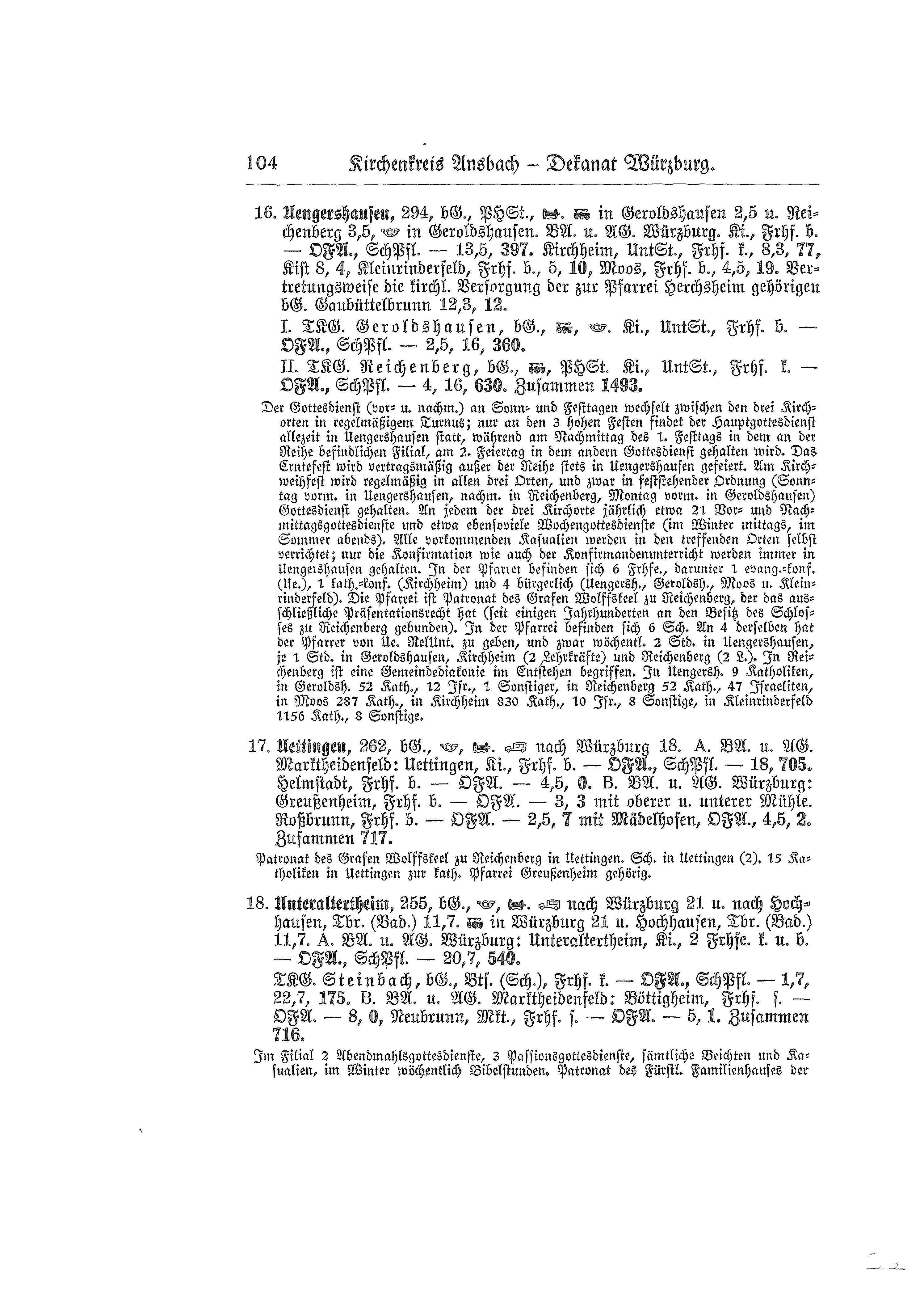 Tochterkirchengemeinde Fuchsstadt, bürgerliche Gemeinde. Bezirksamt und Amtsgericht Ochsenfurt. Kirche, Friedhof bürgerlich - Ortsfürsorgeausschuß (Pfarrer Vorsitz), Schulpflegschaft - 3,5 km [zum Pfarrsitz], 13 km, 312 Seelen. Zusammen 485 Seelen.