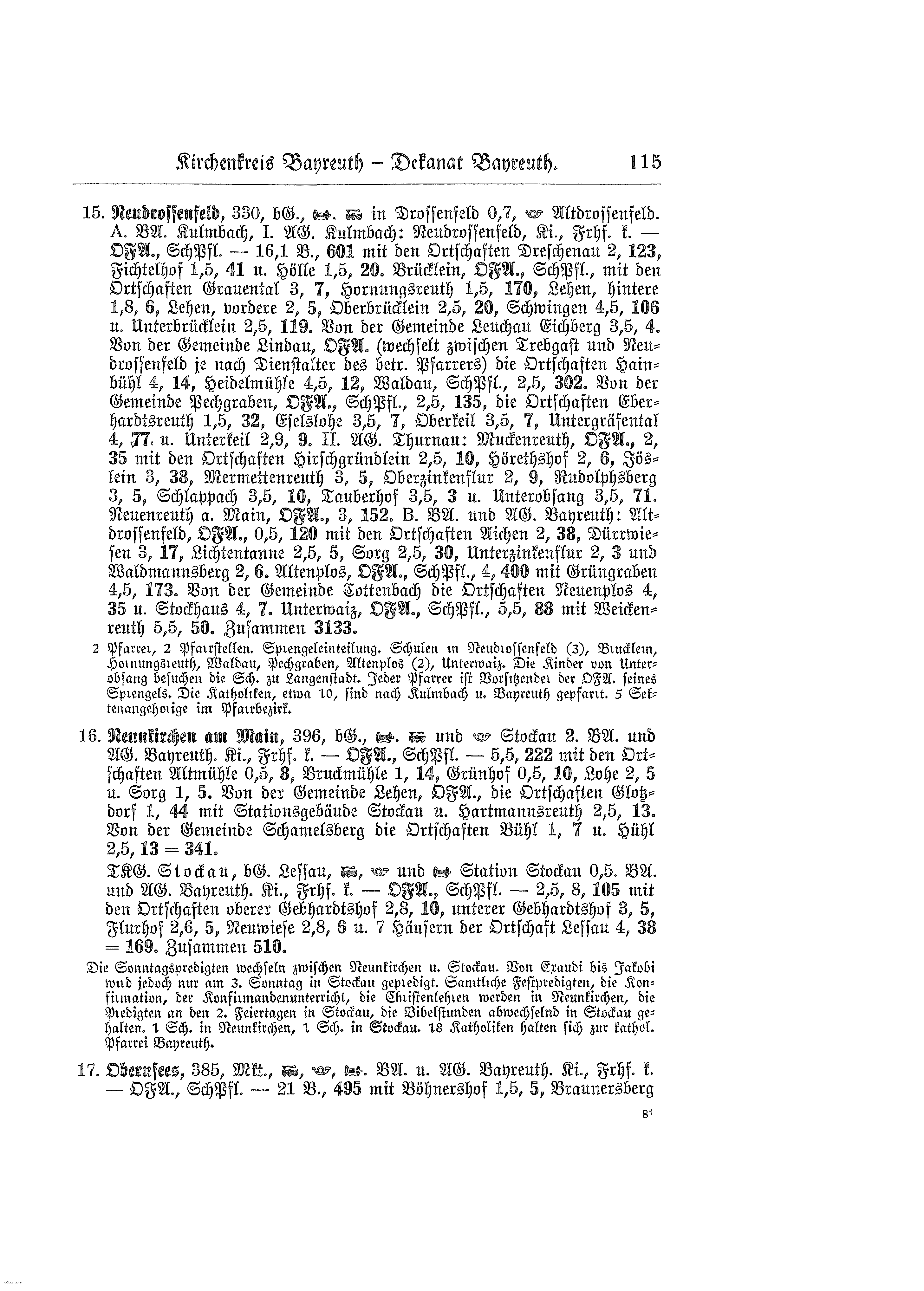 410 m, bürgerliche Gemeinde, Bahn, Post, Telefon. Bezirksamt und Amtsgericht Bayreuth. Kirche, Friedhof konfessionell evangelisch - Ortsfürsorgeausschuß (Pfarrer Vorsitz), Schulpflegschaft - 9,4 Bahnkilometer, 661 Seelen mit Finkenmühle 1 km, 11 Seelen, Poppenmühle 2 km, 6 Seelen, Schnörleinsmühle 1,2 km, 7 Seelen, Sonnenleithen 2,2 km, 4 Seelen, Zeckenmühle 2 km, 9 Seelen. Zusammen 698 Seelen.