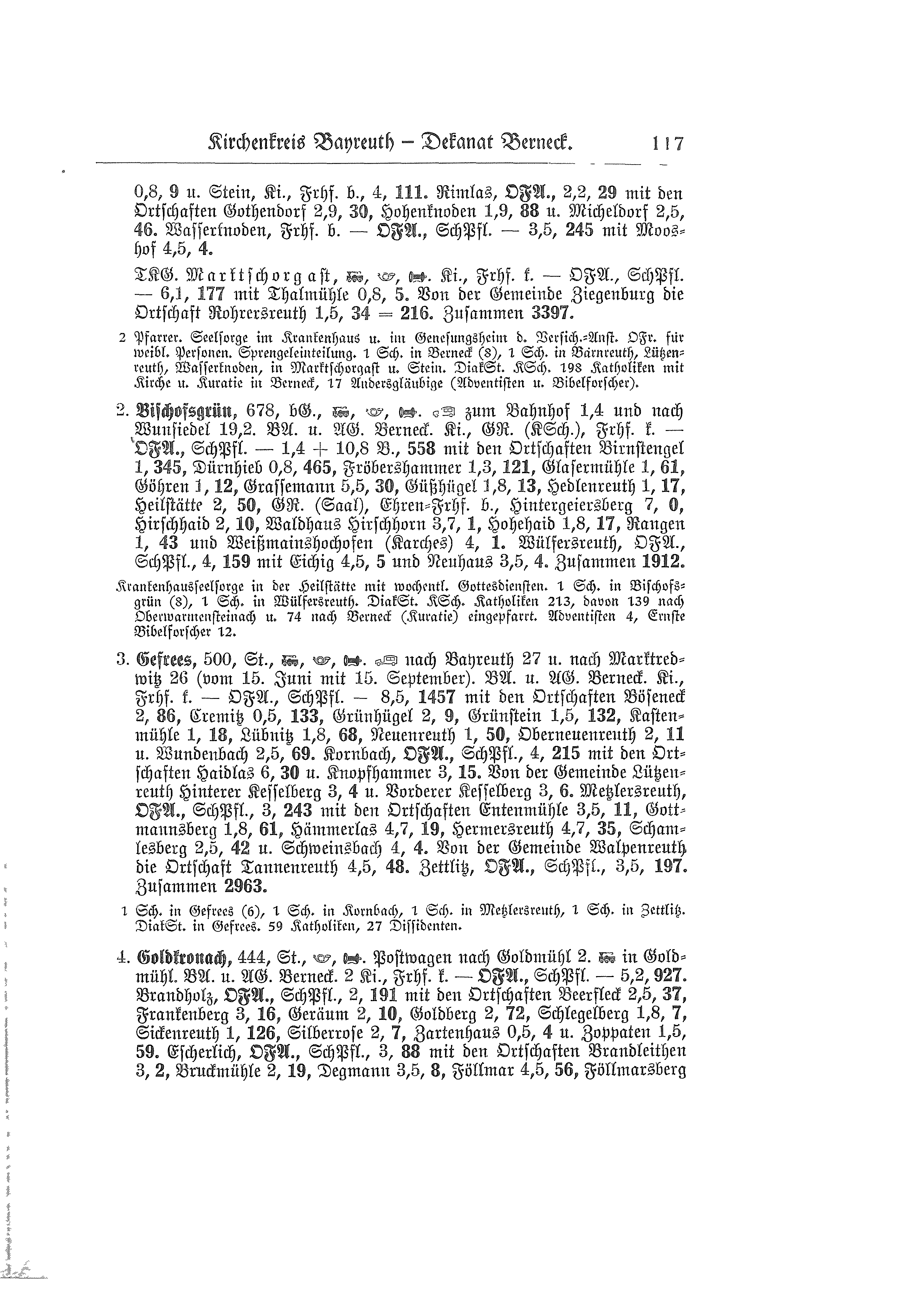 465 m, Markt, Bahn, Post, Telefon. Bezirksamt Bayreuth, I. Amtsgericht Weidenberg: Weidenberg, Kirche, Friedhof konfessionell evangelisch - Ortsfürsorgeausschuß (Pfarrer Vorsitz), Schulpflegschaft - 14 km, 1.169 Seelen mit Rosenhammer 1,2 km, 21 Seelen, Schafhof 1,5 km, 5 Seelen, Schuhmühle 1 km, 3 Seelen, Stadelhaus 0,5 km, 6 Seelen und Ziegelhütte 0,5 km, 39 Seelen. Fischbach, Ortsfürsorgeausschuß (Pfarrer Vorsitz), Schulpflegschaft, 3 km, 76 Seelen mit Altenreuth 4 km, 6 Seelen, Sandhof 3 km, 14 Seelen und Waizenreuth 2 km, 49 Seelen. Görschnitz, Ortsfürsorgeausschuß (Pfarrer Vorsitz), Schulpflegschaft, 2,9 km, 135 Seelen mit Au 4 km, 2 Seelen, Eichleithen 5 km, 6 Seelen, Gossenreuth Haus Nr. 10 und 11 4 km, 17 Seelen, Grund 2,5 km, 14 Seelen, Heßlach 3 km, 87 Seelen und Lochmühle 4 km, 8 Seelen. Mengersreuth, Ortsfürsorgeausschuß (Pfarrer Vorsitz), Schulpflegschaft, 2,5 km, 94 Seelen mit Kattersreuth 5,5 km, 12 Seelen, Kolmreuth 4 km, 3 Seelen, Mittlernhammer 2,5 km 38 Seelen, Rügersberg 4 km, 45 Seelen und Wildenreuth 5 km, 7 Seelen. Von der Gemeinde Seybothenreuth die Ortschaften Döberschütz 4 km, 90 Seelen und Fenkensees 5,5 km, 82 Seelen. Sophiental, Ortsfürsorgeausschuß (Pfarrer Vorsitz), 4 km, 194 Seelen mit Neuhaus 6 km, 1 Seele. Tressau 6,5 km, 1 Seele mit Kirmsees 4,5 km, 13 Seelen und Zenkenlohe. Von der Gemeinde Warmensteinach die Ortschaftten Brunnenhaus 5,4 km, 1 Seele, Neuwerk 5 km, 9 Seelen und Zainhammer 6 km, 10 Seelen. II. Amtsgericht Bayreuth. 13 Häuser von Lessau 4 km, 101 Seeeln mit Köhlerhaus 4 km, 6 Seelen. Charitativ werden pastoriert die Protestanten in Kirchenpingarten 6 km, 1 Seelen. Zusammen 2.348 Seelen.