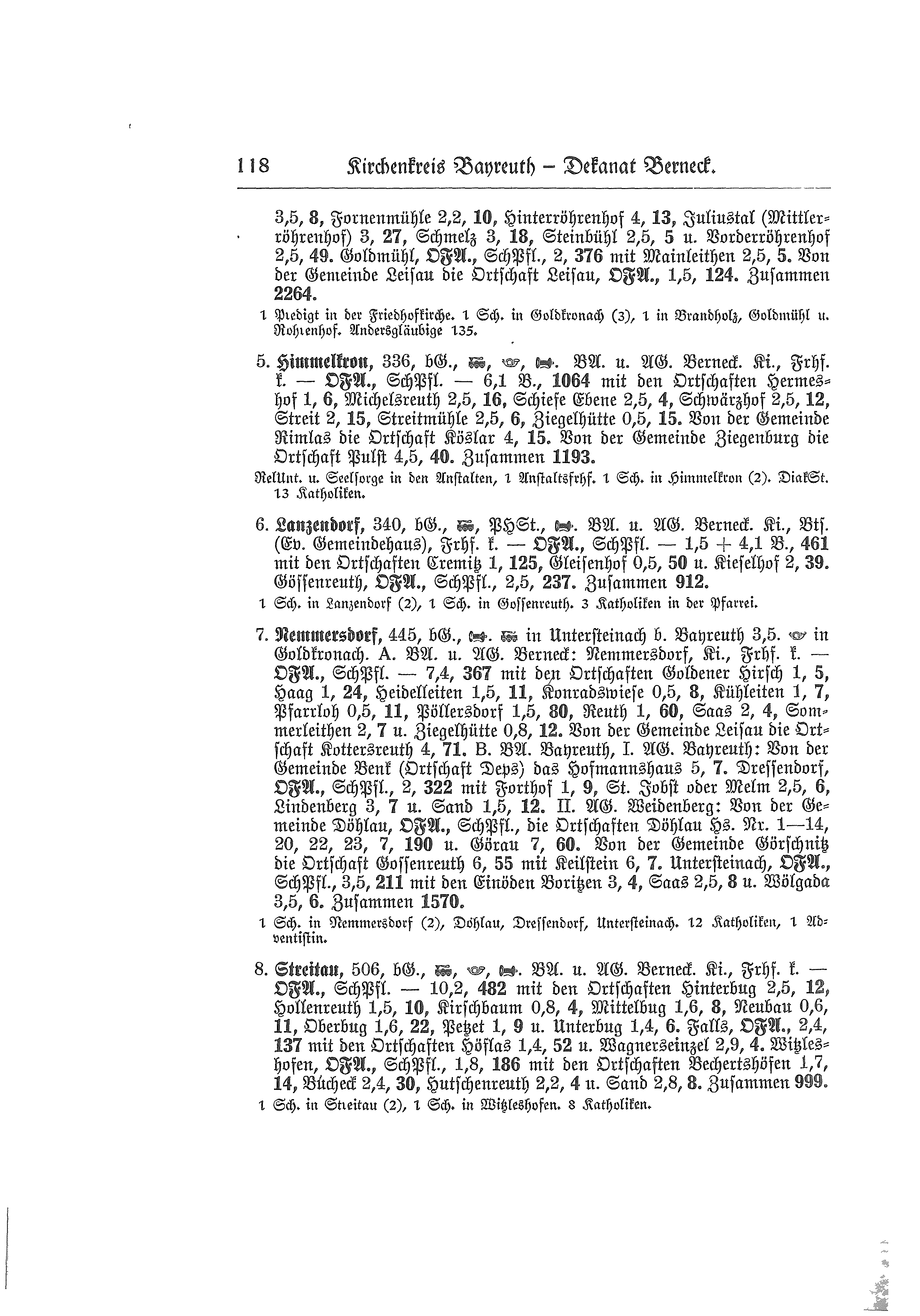 Tochterkirchengemeinde Marktschorgast, Post, Telefon. Kirche, Friedhof konfessionell evangelisch - Ortsfürsorgeausschuß, Schulpflegschaft - 6,1 km, 177 Seelen mit Thalmühle 0,8 km, 5 Seelen. Von der Gemeinde Ziegenburg die Ortschaft Rohrersreuth 1,5 km, 34 Seelen = 216 Seelen . Zusammen 3.397 Seelen.
