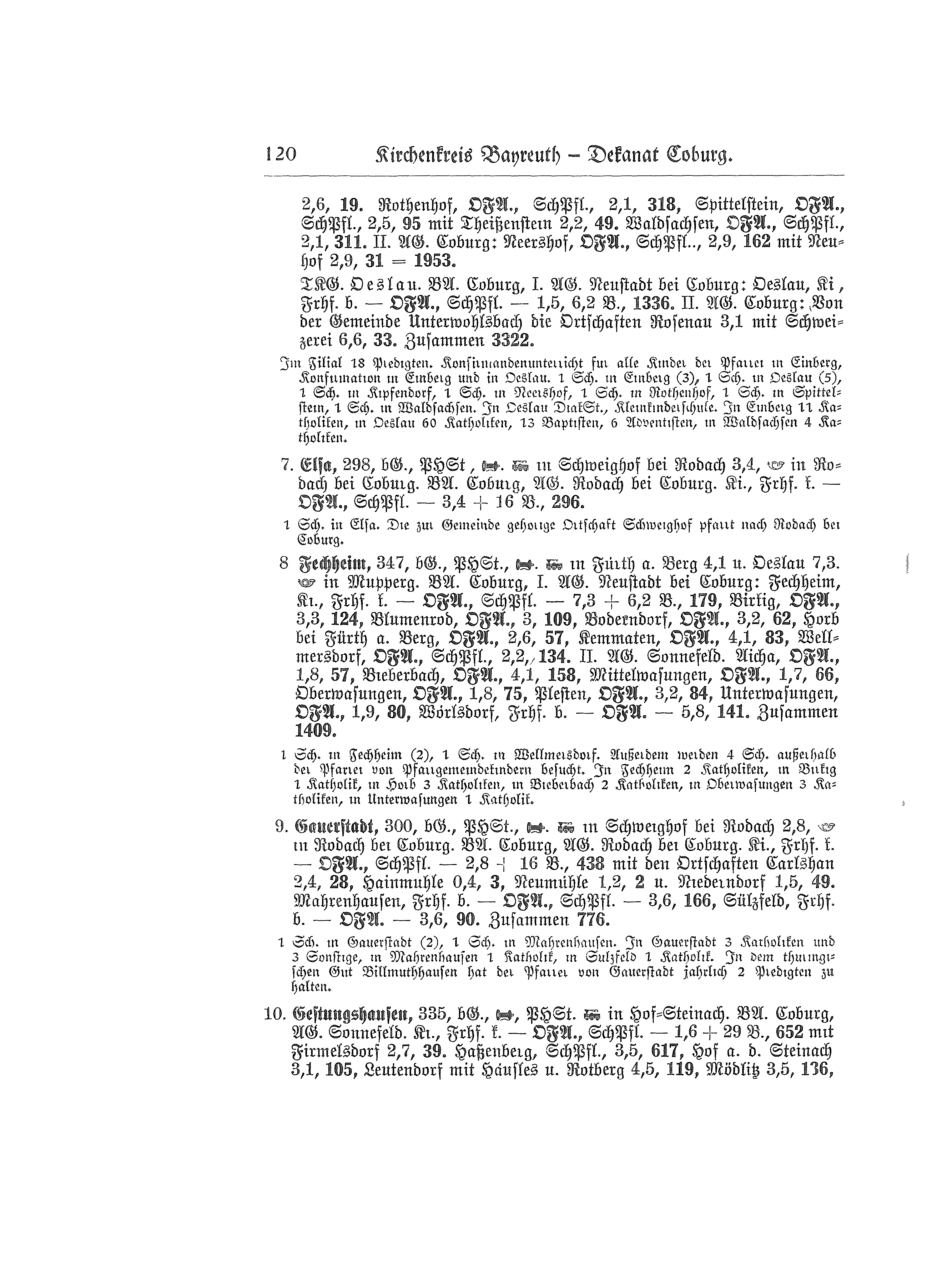 325 m, bürgerliche Gemeinde, Bahn, Post, Telefon. Bezirksamt Coburg, Amtsgericht Sonnefeld. Kirche, Friedhof konfessionell evangelisch - Ortsfürsorgeausschuß (Pfarrer Vorsitz), Schulpflegschaft - 11 Bahnkilometer, 1.161 Seelen. Frohnlach, Ortsfürsorgeausschuß (Pfarrer Vorsitz), Schulpflegschaft, 1,6 km, 810 Seelen. Zusammen 1.971 Seelen.