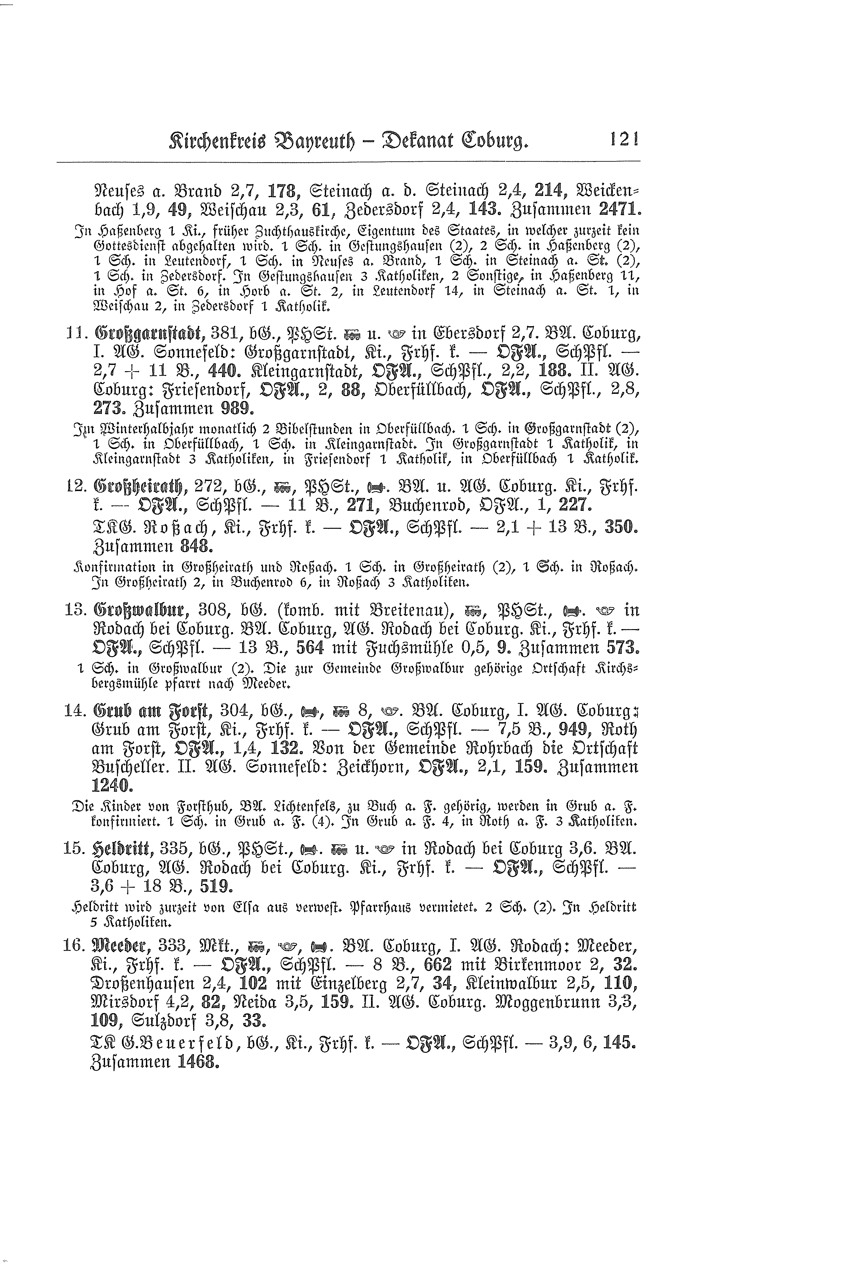 347 m, bürgerliche Gemeinde, Posthilfsstation, Telefon. Bahn in Fürth a. Berg 4,1 km und Oeslau 7,3 km. Post in Mupperg. Bezirksamt Coburg, I. Amtsgericht Neustadt bei Coburg: Fechheim, Kirche, Friedhof konfessionell evangelisch - Ortsfürsorgeausschuß (Pfarrer Vorsitz), Schulpflegschaft - 7,3 km + 6,2 Bahnkilometer, 179 Seelen, Birkig, Ortsfürsorgeausschuß (Pfarrer Vorsitz), 3,3 km, 124 Seelen, Blumenrod, Ortsfürsorgeausschuß (Pfarrer Vorsitz), 3 km, 109 Seelen, Boderndorf, Ortsfürsorgeausschuß (Pfarrer Vorsitz), 3,2 km, 62 Seelen, Horb bei Fürth a. Berg, Ortsfürsorgeausschuß (Pfarrer Vorsitz), 2,6 km, 57 Seelen, Kemmaten, Ortsfürsorgeausschuß (Pfarrer Vorsitz), 4,1 km, 83 Seelen, Wellmersdorf, Ortsfürsorgeausschuß (Pfarrer Vorsitz), Schulpflegschaft, 2,2 km, 134 Seelen. II. Amtsgericht Sonnefeld. Aicha, Ortsfürsorgeausschuß (Pfarrer Vorsitz), 1,8 km, 57 Seelen, Bieberbach, Ortsfürsorgeausschuß (Pfarrer Vorsitz), 4,1 km, 158 Seelen, Mittelwasungen, Ortsfürsorgeausschuß (Pfarrer Vorsitz), 1,7 km, 66 Seelen, Oberwasungen, Ortsfürsorgeausschuß (Pfarrer Vorsitz), 1,8 km, 75 Seelen, Plesten, Ortsfürsorgeausschuß (Pfarrer Vorsitz), 3,2 km, 84 Seelen, Unterwasungen, Ortsfürsorgeausschuß (Pfarrer Vorsitz), 1,9 km, 80 Seelen, Wörlsdorf, Friedhof bürgerlich - Ortsfürsorgeausschuß (Pfarrer Vorsitz) - 5,8 km, 141 Seelen. Zusammen 1.409 Seelen.