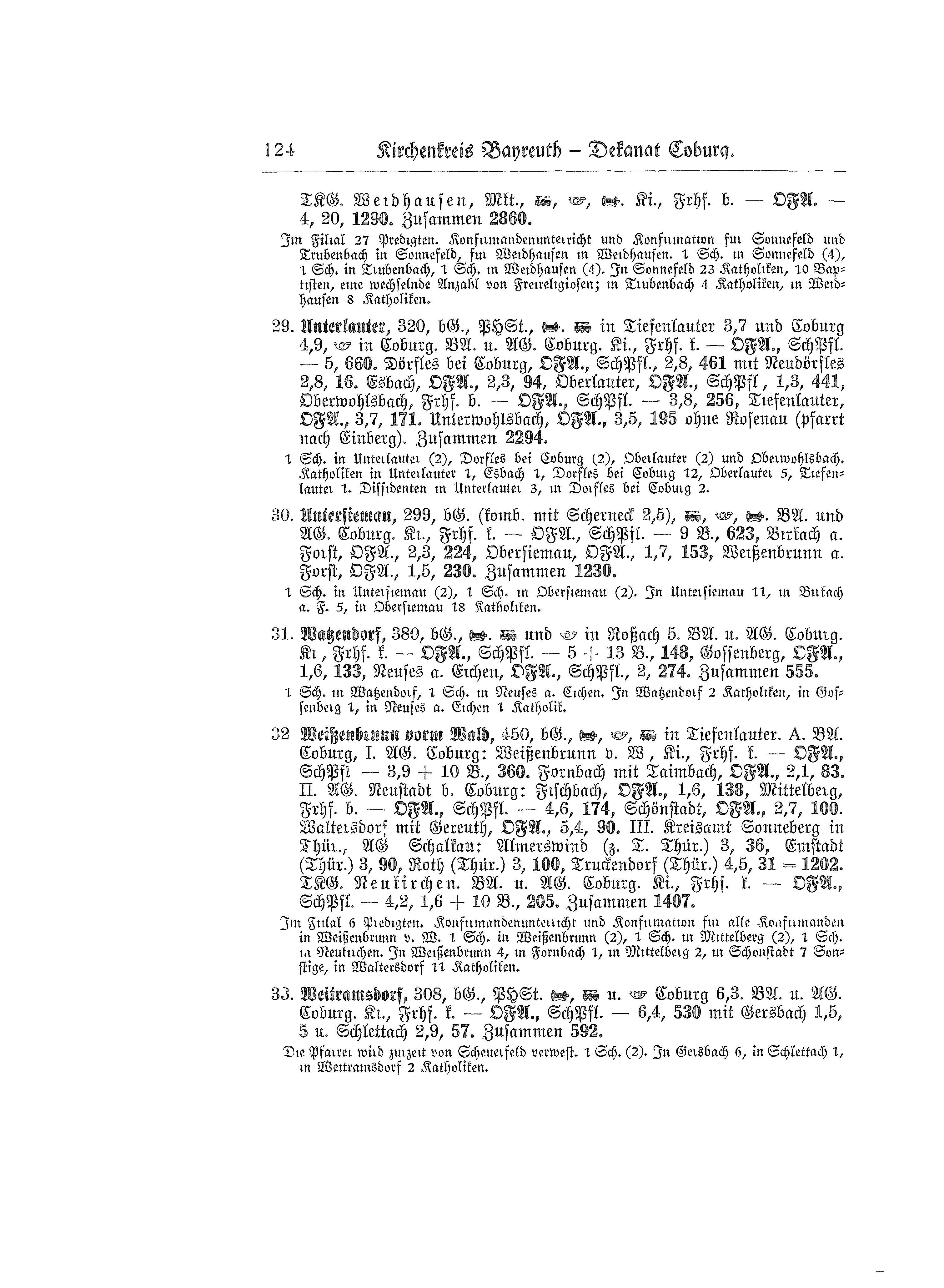 315 m, Markt, Bahn, Post, Telefon. Bus nach Coburg 16 km. Bezirksamt Coburg, Amtsgericht Sonnefeld. 2 Kirchen, Friedhof bürgerlich - Ortsfürsorgeausschuß (Pfarrer Vorsitz), Schulpflegschaft - 16 Bahnkilometer, 1.333 Seelen. Trübenbach, Friedhof bürgerlich - Ortsfürsorgeausschuß (Pfarrer Vorsitz), Schulpflegschaft - 6 km, 247 Seelen.