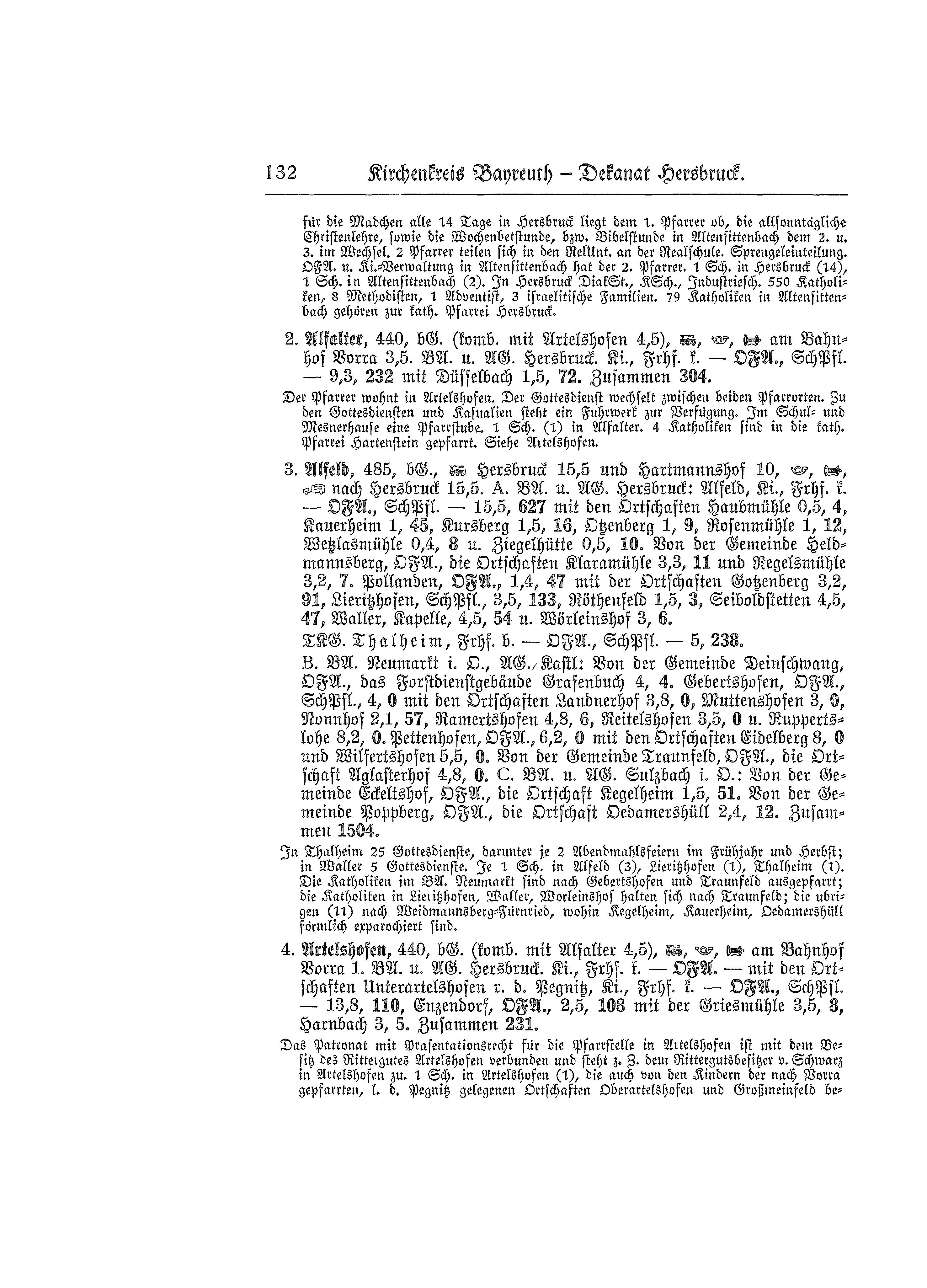 Tochterkirchengemeinde Altensittenbach, bürgerliche Gemeinde, Bahn und Post Hersbruck r. d. Pegnitz, Telefon. Kirche, Friedhof konfessionell evangelisch - Ortsfürsorgeausschuß, Schulpfegschaft - 1,4 km, 871 Seelen mit Hagenmühle 1,8 km, 11 Seelen = 882 Seelen. Zusammen 5.201 Seelen.