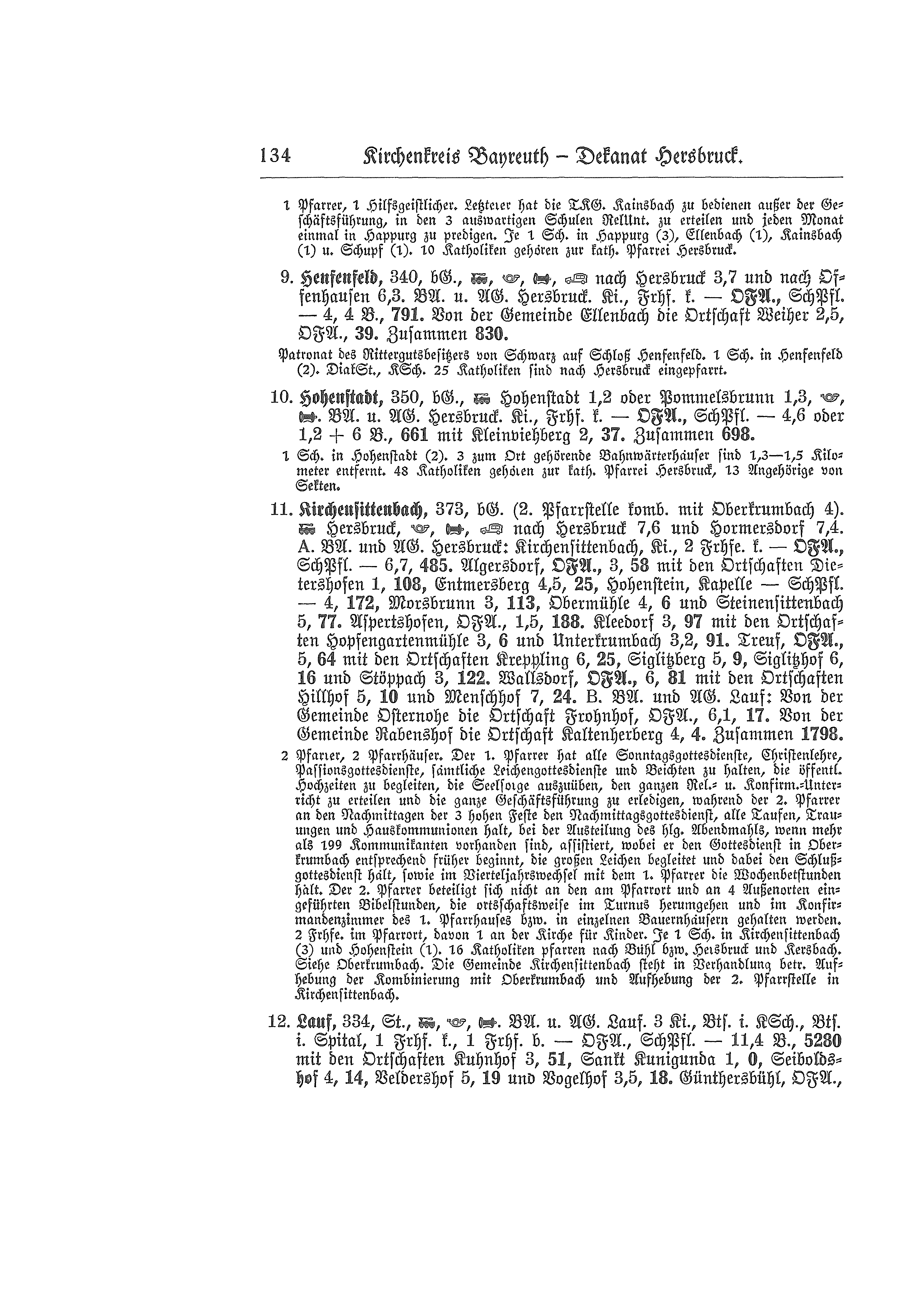 Tochterkirchengemeinde Hirschbach, bürgerliche Gemeinde, Bahn in Hohenstadt 7,8 km, Posthilfsstation, Telefon. Kirche - Ortsfürsorgeausschuß (Pfarrer Vorsitz), Schulpflegschaft - 5,2 km [vom Pfarrsitz], 7,8 km + 5,9 Bahnkilometer, 312 Seelen mit Stoffelmühle. Zusammen 1.161 Seelen.