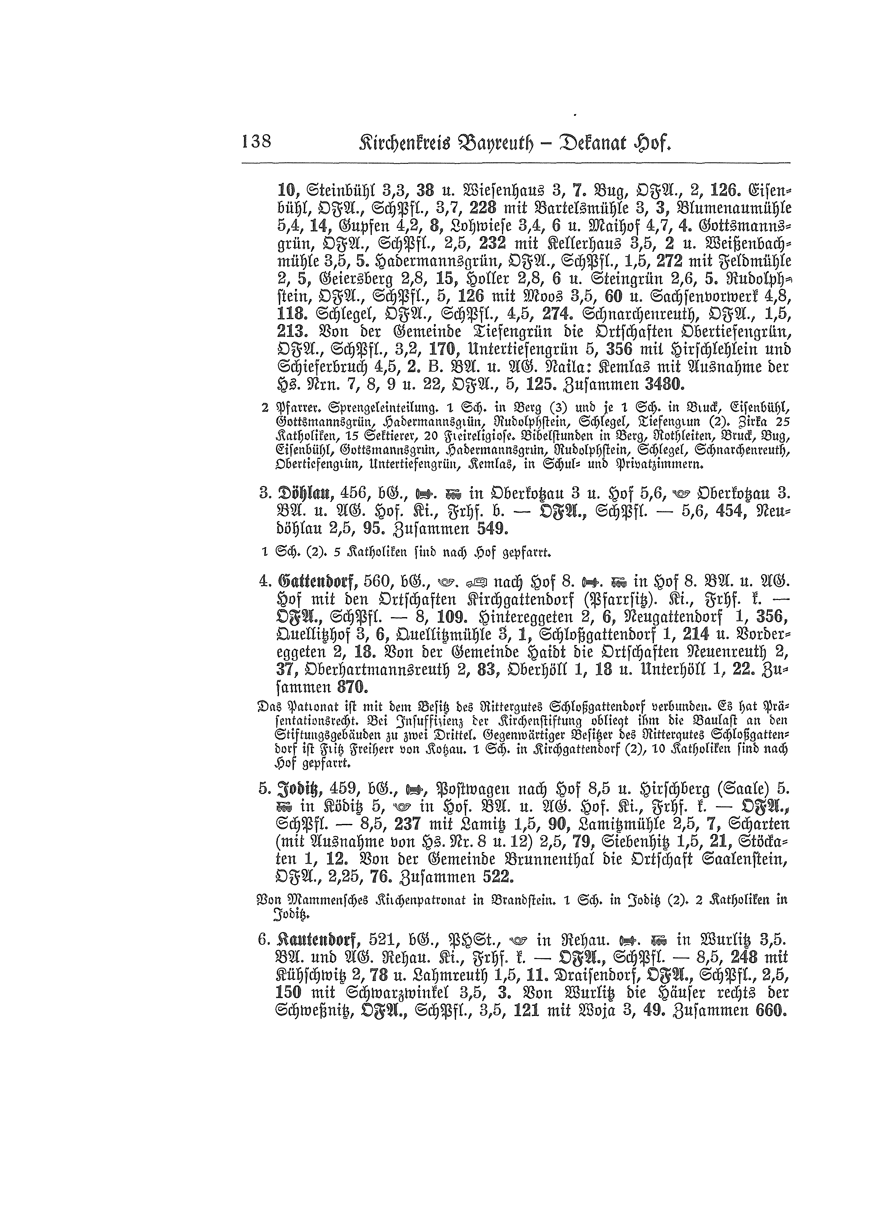 485 m, Unmittelbare Stadt, Post, Telefon. Bus nach Lichtenberg 23,4 km, nach Konradsreuth 10 km, nach Hirschberg 16,2 km, nach Olsnitz 24,6 km. 3 Kirchen, Betsaal (Johanneshaus), Friedhof bürgerlich - Ortsfürsorgeausschuß (Pfarrer Vorsitz), Schulpflegschaft - 41.377 Seelen. Bezirksamt und Amtsgericht Hof. Brunnenthal 5,5 km, 144 Seelen mit Papiermühle 6 km, 17 Seelen. Von der Gemeinde Föhrenreuth die Ortschaften Brand 6,8 km, 15 Seelen, Pirk und Stein 6,5 km, 9 Seelen, Haidt 3,8 km, 446 Seelen mit Gumpertsreuth, Schulpflegschaft, 6,8 km, 126 Seelen. Leimitz, Schulpflegschaft, 4,2 km, 231 Seelen mit Döberlitz 5,9 km, 69 Seelen, Eichelberg 1,7 km, 9 Seelen, Jägersruh 3 km, 91 Seelen und Petersziegelei 1,2 km, 235 Seelen. Von der Gemeinde Martinsreuth: Eppenreuth, Schulpflegschaft, 6 km, 197 Seelen und Lausenhof 5,6 km, 14 Seelen. Tauperlitz, Schulpflegschaft, 5,5 km, 391 Seelen mit Neutauperlitz 4,9 km, 166 Seelen und Stumpfhof 5 km, 7 Seelen. Unterkotzau Schulpflegschaft, 3,2 km, 541 Seelen. Wölbattendorf, Schulpflegschaft, 5,5 km, 656 Seelen, mit Geigen 3,7 km, 9 Seelen, Haag 4,8 km, 10 Seelen, Hohensaas 3,3 km, 61 Seelen, Osseck, Schulpflegschaft, 4,5 km, 140 Seelen, Quetschen 4,1 km, 6 Seelen und Rosenbühl 3,5 km, 12 Seelen. Zedtwitz, Schulpflegschaft, 5,1 km, 603 Seelen mit Forst 5,9 km, 36 Seelen und Schafhübel 5,6 km, 54 Seelen.
