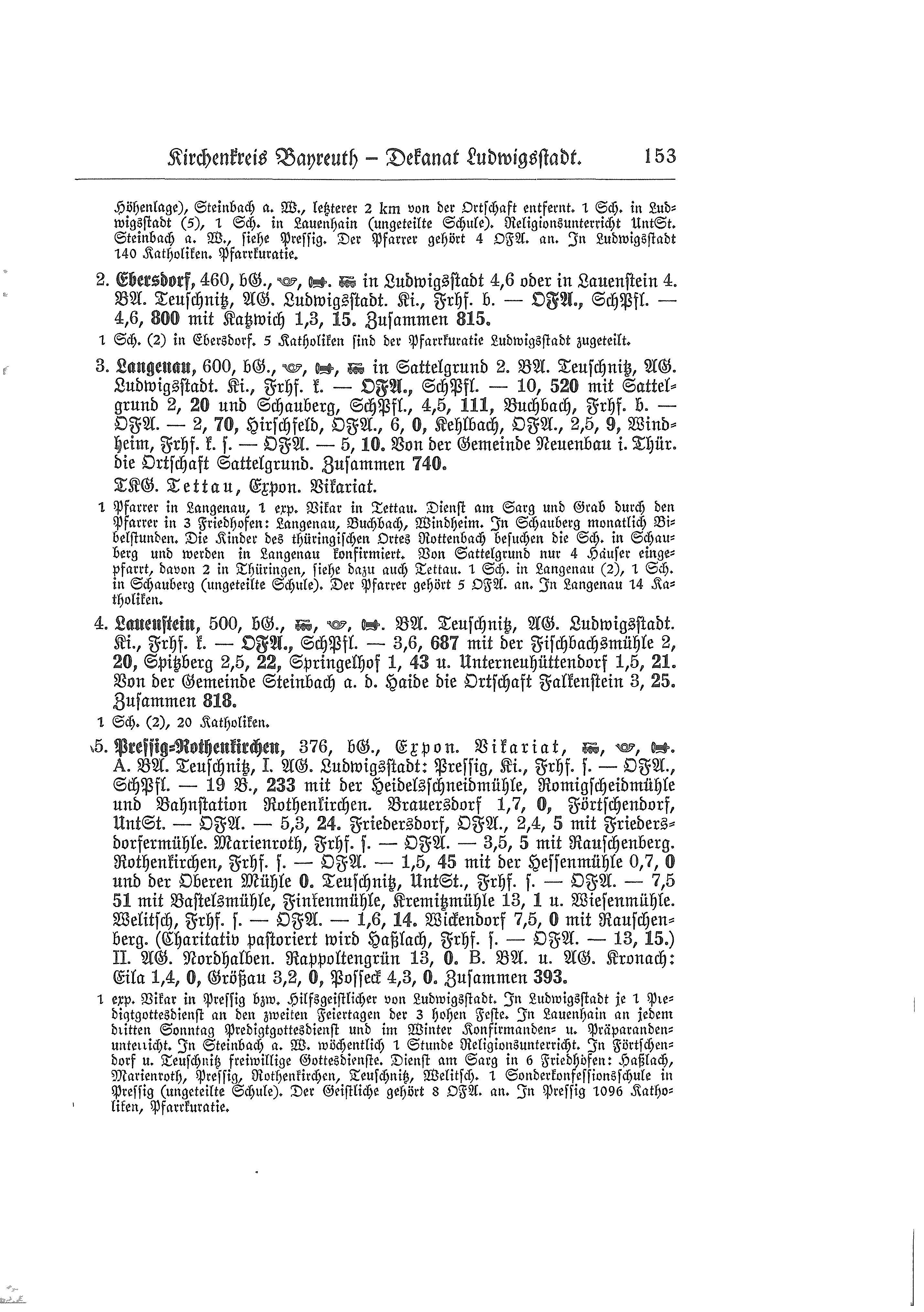 458 m, Markt, Bahn, Post, Telefon. Bezirksamt Teuschnitz, Amtsgericht Ludwigsstadt. Kirche, Friedhof bürgerlich - Ortsfürsorgeausschuß (Pfarrer Vorsitz), Schulpflegschaft - 1.364 Seelen mit Leinenmühle 2 km, 12 Seelen, Oberneuhüttendorf 1,5 km, 110 Seelen, Thümahof 1,5 km, 22 Seelen und Weidmannsheil 5 km, 3 Seelen, Ottendorf, Ortsfürsorgeausschuß (Pfarrer Vorsitz), 1 km, 231 Seelen, Steinbach a. W., Unterrichtsstation, Friedhof simultan - Ortsfürsorgeausschuß (Pfarrer Vorsitz) - 7,5 km, 26 Seelen mit Kohlmühle und Steinbachermühle.