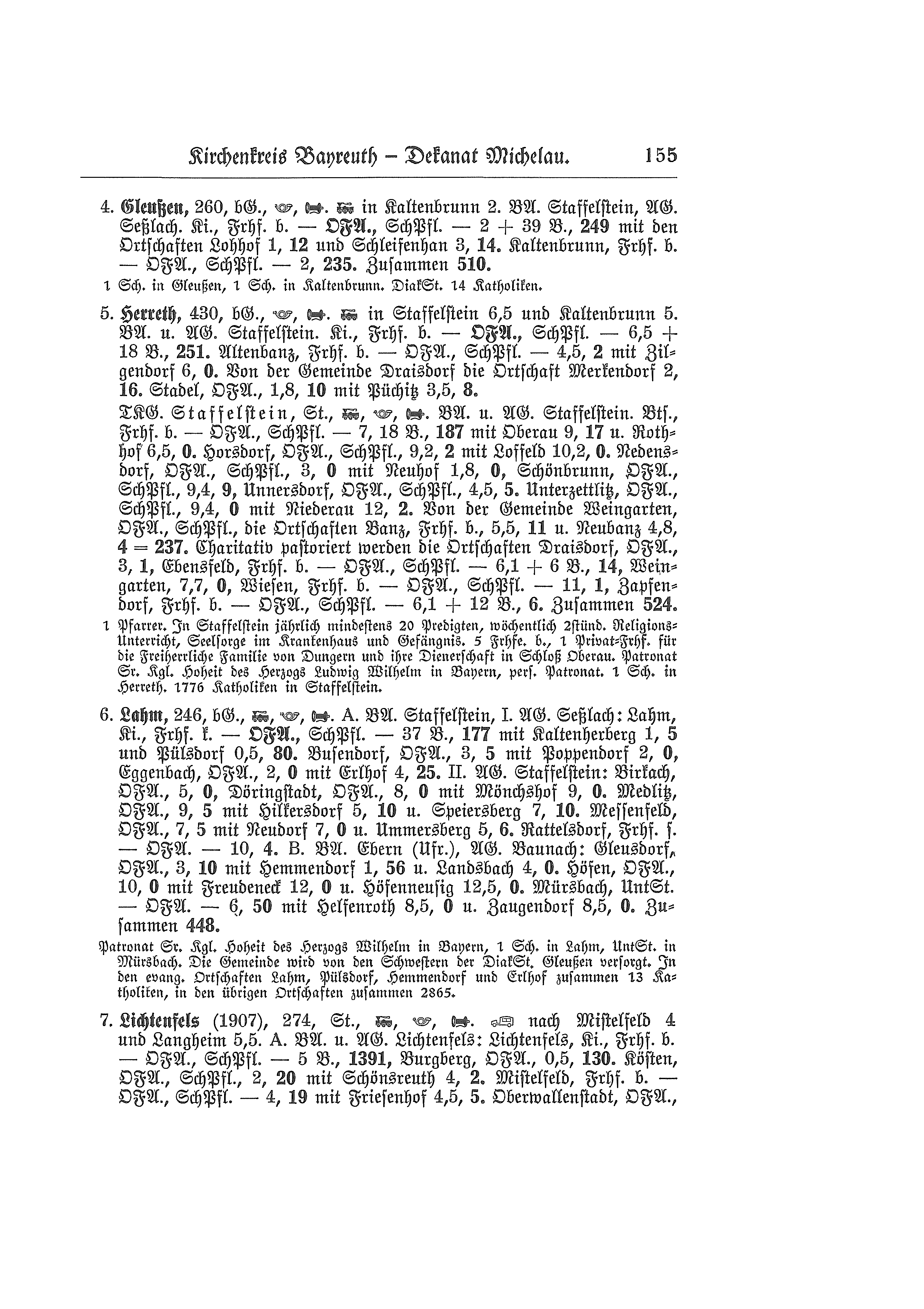 280 m, bürgerliche Gemeinde, Post, Telefon. Bahn in Dietersdorf i. Ofr. 2,2 km und Coburg 17 km. Bezirksamt Staffelstein, Amtsgericht Seßlach. Kirche, Friedhof bürgerlich - Ortsfürsorgeausschuß (Pfarrer Vorsitz), Schulpflegschaft - 2,2 km + 59,5 Bahnkilometer oder 17 km + 25 Bahnkilometer, 377 Seelen mit Gehegsmühle 2 km, 5 Seelen, Autenhausen, Ortsfürsorgeausschuß, 2,2 km, 59 Seelen, Dietersdorf, Friedhof simultan - Ortsfürsorgeausschuß - 1,5 km, 133 Seelen. Von der Gemeinde Lechenroth die Ortschaft Muggenbach 2,5 km, 3 Seelen, Merlach, Friedhof bürgerlich - Ortsfürsorgeausschuß, Schulpflegschaft - 4,6 km, 80 Seelen. Charitativ pastoriert wird die Gemeinde Gleismuthhausen, Friedhof simultan, 6,4 km, 74 Seelen. Zusammen 657 Seelen.