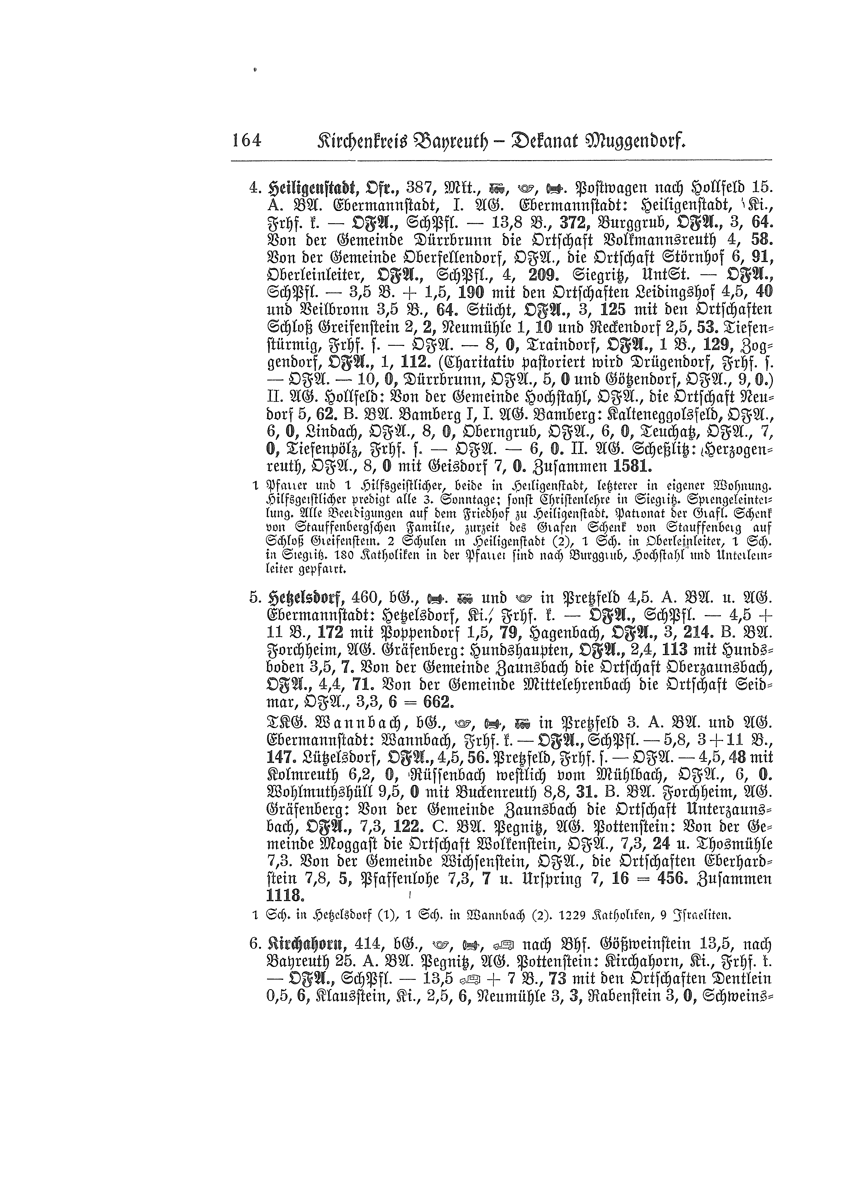 323 m, Markt, Bahn, Post, Telefon. A. Bezirksamt Ebermannstadt, I. Amtsgericht Ebermannstadt: Muggendorf, Kirche, Friedhof konfessionell evangelisch - Ortsfürsorgeausschuß (Pfarrer Vorsitz), Schulpflegschaft - 485 Seelen mit Wöhr 1,5 km, 20 Seelen. Albertshof, Ortsfürsorgeausschuß (Pfarrer Vorsitz), 2,9 km, 113 Seelen mit den Ortschaften Kuchenmühle 4,5 km, 7 Seelen und Neudorf 4 km, 70 Seelen. Von der Gemeinde Birkenreuth die Ortschaft Trainmeusel, Ortsfürsorgeausschuß, 1,7 km, 89 Seelen. Burggaillenreuth, Ortsfürsorgeausschuß, 4,2 km, 1 Seelen mit Windischgaillenreuth 5,6 km, 0 Seelen. Engelhardtsberg, Ortsfürsorgeausschuß (Pfarrer Vorsitz), Schulpflegschaft, 2,5 km, 225 Selen mit Schottersmühle 3,8 km, 0 Seelen. Wohlmannsgesees, Ortsfürsorgeausschuß (Pfarrer Vorsitz), 1,8 km, 47 Seelen mit Kanndorf 4 km, 48 Seelen. II. Amtsgericht Hollfeld. Charitativ pastoriert wird die Gemeinde Seelig, Ortsfürsorgeausschuß, 6,5 km, 1 Seelen. B. Bezirksamt Pegnitz, Amtsgericht Pottenstein: Behringersmühle, Ortsfürsorgeausschuß, 5,4 Bahnkilometer + 2,7 km, 3 Seelen mit den Ortschaften Moritz 5,5 km, 0 Seelen, Stempfermühle 5,4 Bahnkilometer + 1,2 km, 1 Seelen und Wölm 4,1 km, 76 Seelen. Gößweinstein, Friedhof simultan - Ortsfürsorgeausschuß - 5,4 Bahnkilometer + 4,2 km, 3 Seelen, Leutzdorf, Ortsfürsorgeausschuß, 6,4 km, 0 Seelen mit den Ortschaften Etzdorf 11,6 km, 4 Seelen, Sachsenmühle 5,4 Bahnkilometer, 5 Seelen und Türkelstein 12 km, 0 Seelen. Moggast, Friedhof simultan - Ortsfürsorgeausschuß - 5,4 km, 6 Seelen. Stadelhofen, Ortsfürsorgeausschuß, 11,8 km, 0 Seelen mit den Ortschaften Allersdorf 13,3 km, 0 Seelen, Bösenbirkig, 11,5 km, 0 Seelen, Geiselhöhe 12,6 km, 0 Seelen, Prügeldorf 12 km, 0 Seelen und Sachsendorf 12,7 km, 0 Seelen. Tüchersfeld, Ortsfürsorgeausschuß, 5,4 Bahnkilometer + 4,8 km, 0 Seelen mit den Ortschaften Arnleithen 11,3 km, 0 Seelen, Hünerlohe 11,9 km, 0 Seelen und Kohlstein 10,7 km, 1 Seelen. Zusammen 1.204 Seelen.