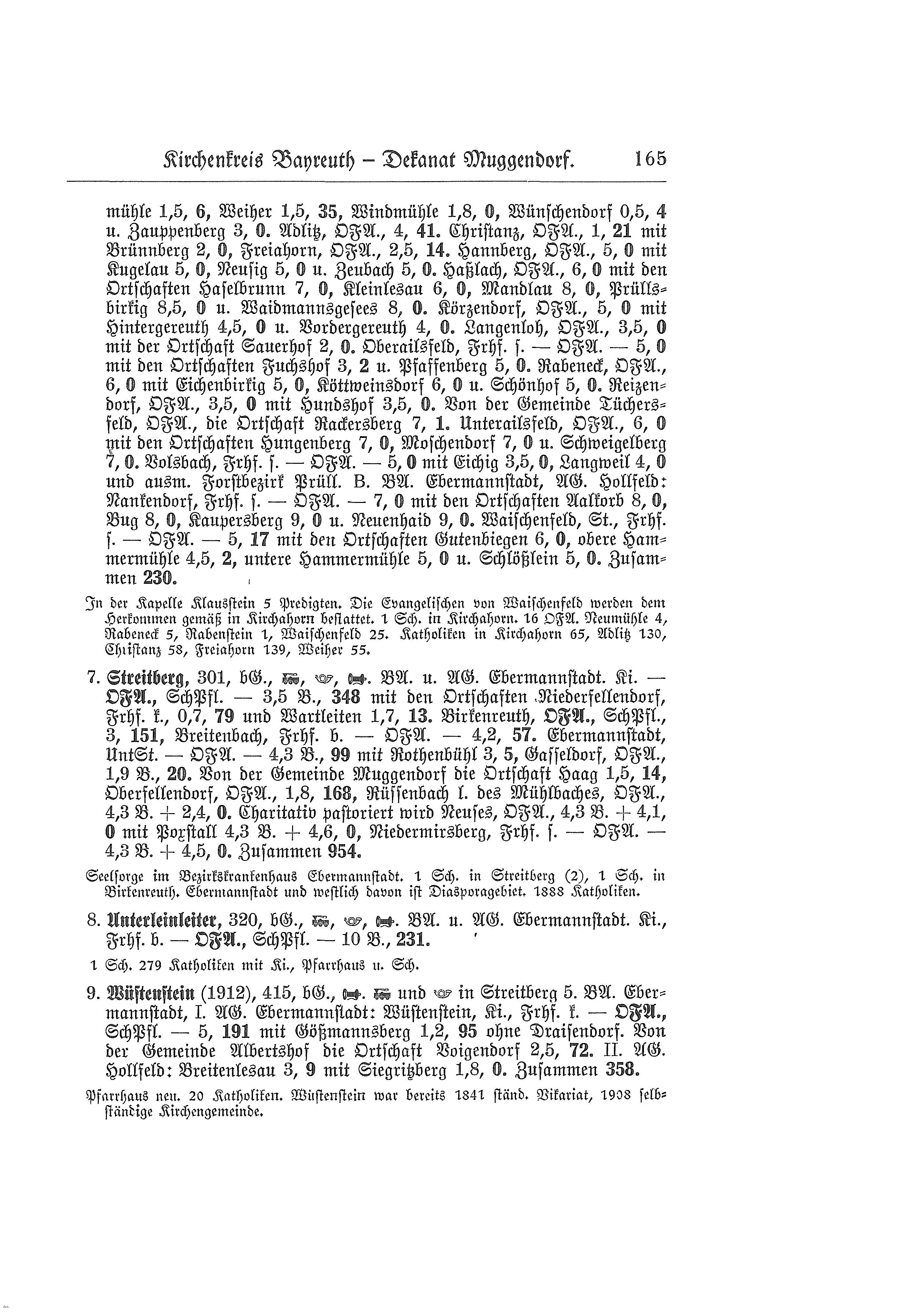 387 m, Markt, Bahn, Post, Telefon. Postwagen nach Hollfeld 15 km. A. Bezirksamt Ebermannstadt, I. Amtsgericht Ebermannstadt: Heiligenstadt, Kirche, Friedhof konfessionell evangelisch - Ortsfürsorgeausschuß (Pfarrer Vorsitz), Schulpflegschaft - 13,8 Bahnkilometer, 372 Seelen, Burggrub, Ortsfürsorgeausschuß (Pfarrer Vorsitz), 3 km, 64 Seelen. Von der Gemeinde Dürrbrnnn die Ortschaft Volkmannsreuth 4 km, 58 Seelen. Von der Gemeinde Oberfellendorf, Ortsfürsorgeausschuß, die Ortschaft Störnhof 6 km, 91 Seelen, Oberleinleiter, Ortsfürsorgeausschuß (Pfarrer Vorsitz), Schulpflegschaft, 4 km, 209 Seelen. Siegritz, Unterrichtsstation - Ortsfürsorgeausschuß (Pfarrer Vorsitz), Schulpflegschaft - 3,5 Bahnkilometer + 1,5 km, 190 Seelen mit den Ortschaften Leidingshof 4,5 km, 40 Seelen und Veilbronn 3,5 Bahnkilometer, 64 Seelen. Stücht, Ortsfürsorgeausschuß (Pfarrer Vorsitz), 3 km, 125 Seelen mit den Ortschaften Schloß Greisenstein 2 km, 2 Seelen, Neumühle 1 km, 10 Seelen und Reckendorf 2,5 km, 53 Seelen. Tiefenstürmig, Friedhof simultan - Ortsfürsorgeausschuß - 8 km, 0 Seelen, Traindorf, Ortsfürsorgeausschuß (Pfarrer Vorsitz), 1 Bahnkilometer, 129 Seelen, Zoggendorf, Ortsfürsorgeausschuß (Pfarrer Vorsitz), 1 km, 112 Seelen. (Charitativ pastoriert wird Drügendorf, Friedhof simultan - Ortsfürsorgeausschuß - 10 km, 0 Seelen, Dürrbrunn, Ortsfürsorgeausschuß, 5 km, 0 Seelen und Götzendorf, Ortsfürsorgeausschuß, 9 km, 0 Seelen.) II. Amtsgericht Hollfeld: Von der Gemeinde Hochstahl, Ortsfürsorgeausschuß, die Ortschaft Neudorf 5 km, 62 Seelen. B. Bezirksamt Bamberg I, I. Amtsgericht Bamberg: Kalteneggolsfeld, Ortsfürsorgeausschuß, 6 km, 0 Seelen, Lindach, Ortsfürsorgeausschuß, 8 km, 0 Seelen, Oberngrub, Ortsfürsorgeausschuß, 6 km, 0 Seelen, Teuchatz, Ortsfürsorgeausschuß, 7 km, 0 Seelen, Tiefenpölz, Friedhof simultan - Ortsfürsorgeausschuß - 6 km, 0 Seelen. II. Amtsgericht Scheßlitz: Herzogenreuth, Ortsfürsorgeausschuß, 8 km, 0 Seelen mit Geisdorf 7 km, 0 Seelen. Zusammen 1.581 Seelen.