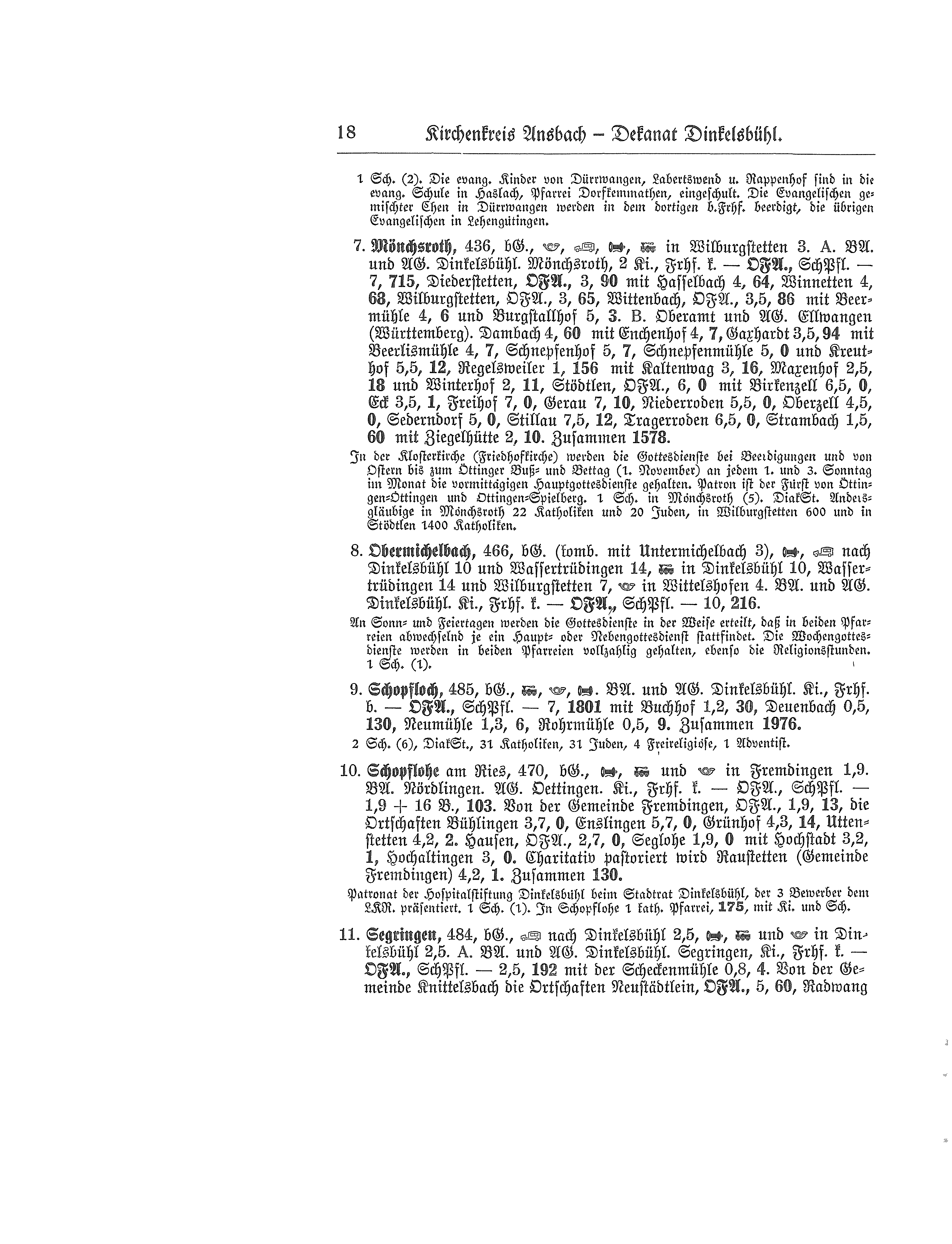 486 m, bürgerliche Gemeinde, Bahn, Telefon, Post in Schopfloch 2 km. Bezirksamt und Amtsgericht Dinkelsbühl. Kirche, Friedhof konfessionell evangelisch - Ortsfürsorgeausschuß (Pfarrer Vorsitz), Schulpflegschaft - 4,5 km, 126 Seelen mit Lehenbuch 1,8 km, 50 Seelen. Dickersbronn, Ortsfürsorgeausschuß (Pfarrer Vorsitz), 1,6 km, 113 Seelen mit Franzenmühle 1,7 km, 5 Seelen und Köhlau 2,4 km, 20 Seelen. Dürrwangen, Ortsfürsorgeausschuß, 6,4 km, 34 Seelen mit Hopfengarten 5 km, 30 Seelen. Labertswend 5,7 km, 12 Seelen. Obermühle 5,5 km, 0 Seelen. Rappenhof 5,7 km, 8 Seelen und Wiesenhof 5,8 km, 0 Seelen. Hellenbach, Ortsfürsorgeausschuß (Pfarrer Vorsitz), 2,1 km, 115 Seelen mit Froschmühle 2 km, 12 Seelen, Kämmleinsmühle 2,1 km, 7 Seelen, Lohe 2,7 km, 28 Seelen und Pfaffenhof 2,1 km, 4 Seelen. Neuses, Ortsfürsorgeausschuß (Pfarrer Vorsitz), 4,5 km, 48 Seelen mit Flinsberg 4,5 km, 46 Seelen und Goschenhof 4,5 km, 6 Seelen. Sulzbach, Ortsfürsorgeausschuß (Pfarrer Vorsitz), 5,5 km, 54 Seelen. Waldhäuslein, Ortsfürsorgeausschuß (Pfarrer Vorsitz), 2 km, 62 Seelen mit Burgstall 2,2 km, 81 Seelen, Pulvermühle 1,2 km, 13 Seelen und Rothhof 2,3 km, 12 Seelen. Zusammen 886 Seelen.