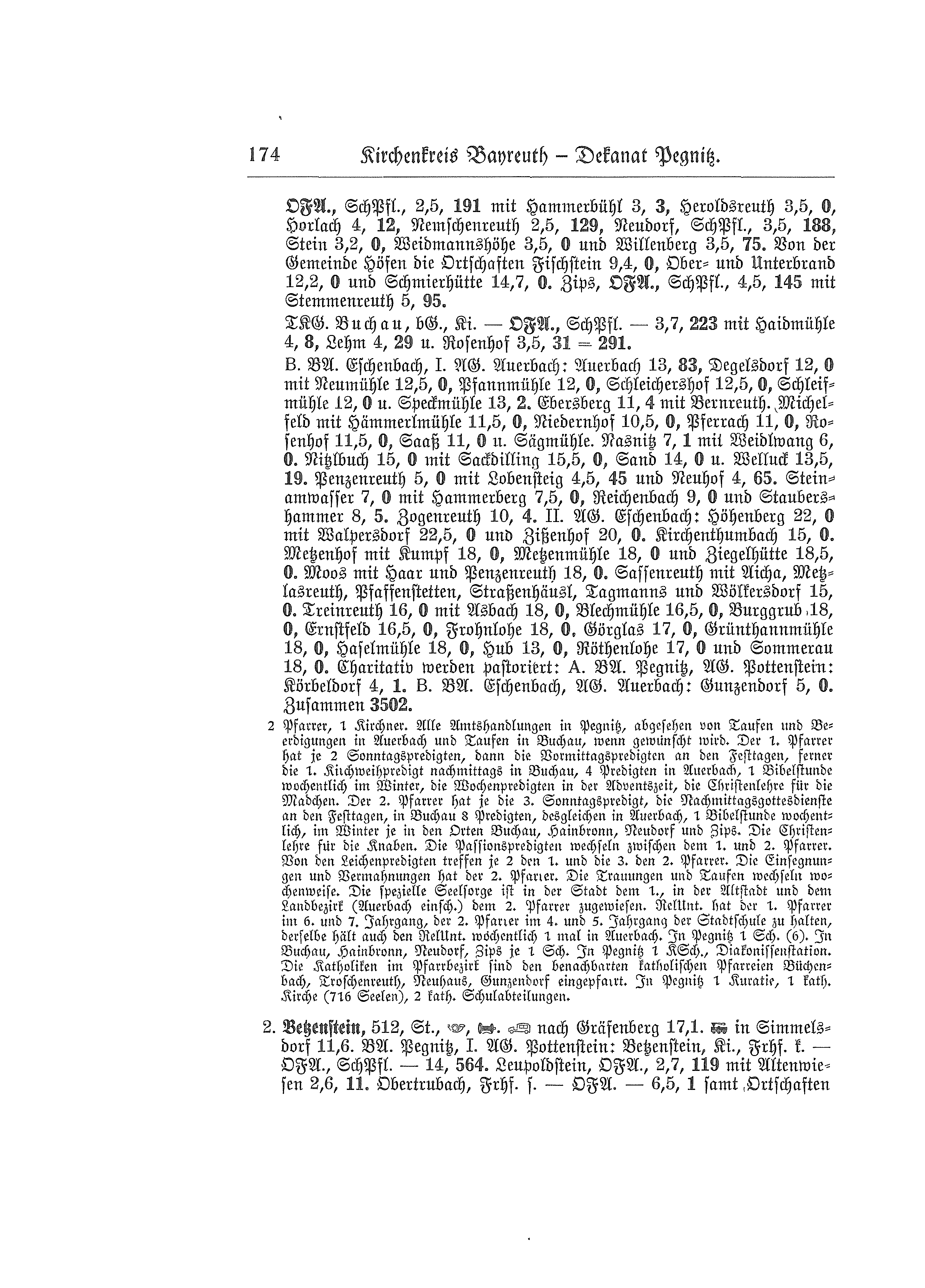13.731 Seelen. Der Dekanatsbezirk umfaßt teilweise die Bezirke der Bezirksämter Pegnitz und Bayreuth im Regierungsbezirk Oberfranken, sowie teilweise den des Bezirksamts Eschenbach im Regierungsbezirk Oberpfalz, sodann den Bezirk des Amtsgerichts Pegnitz und teilweise den der Amtsgerichte Bayreuth, Pottenstein und Weidenberg im Regierungsbezirk Oberfranken, sowie teilweise die Bezirke der Amtsgerichte Auerbach und Eschenbach im Regierungsbezirk Oberpfalz. Zuständig sind die Finanzämter Auerbach, Bayreuth, Eschenbach, Pegnitz und Pottenstein.