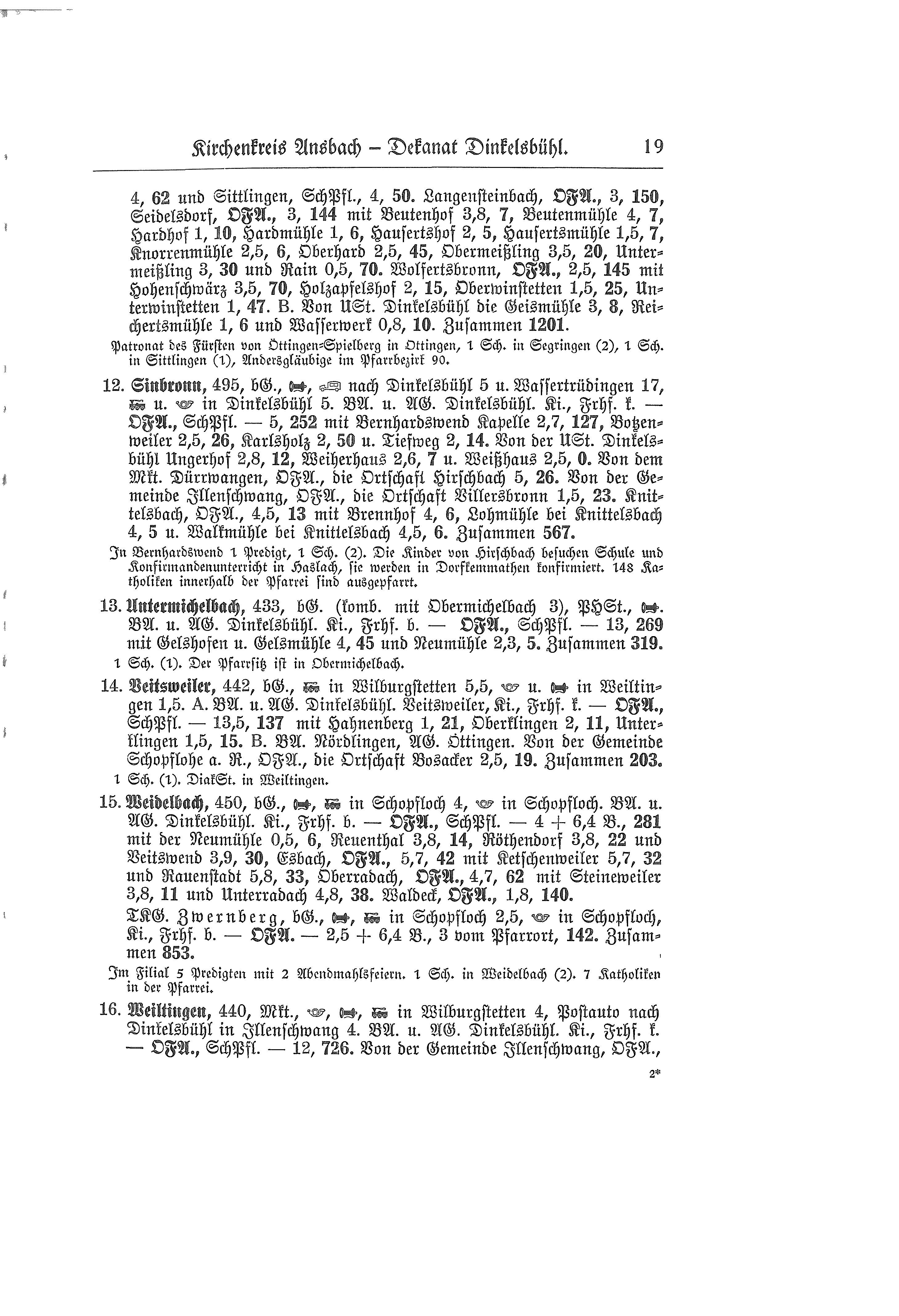 485 m, bürgerliche Gemeinde, Bahn, Post, Telefon. Bezirksamt und Amtsgericht Dinkelsbühl. Kirche, Friedhof bürgerlich - Ortsfürsorgeausschuß (Pfarrer Vorsitz), Schulpflegschaft - 7 km, 1801 Seelen mit Buchhof 1,2 km, 30 Seelen, Deuenbach 0,5 km, 130 Seelen, Neumühle 1,3 km, 6 Seelen, Rohrmühle 0,5 km, 9 Seelen. Zusammen 1976 Seelen. 2 Schulen (6 Lehrkräfte), Gemeindediakonie, 31 Katholiken, 31 Juden, 4 Freireligiöse, 1 Adventist.