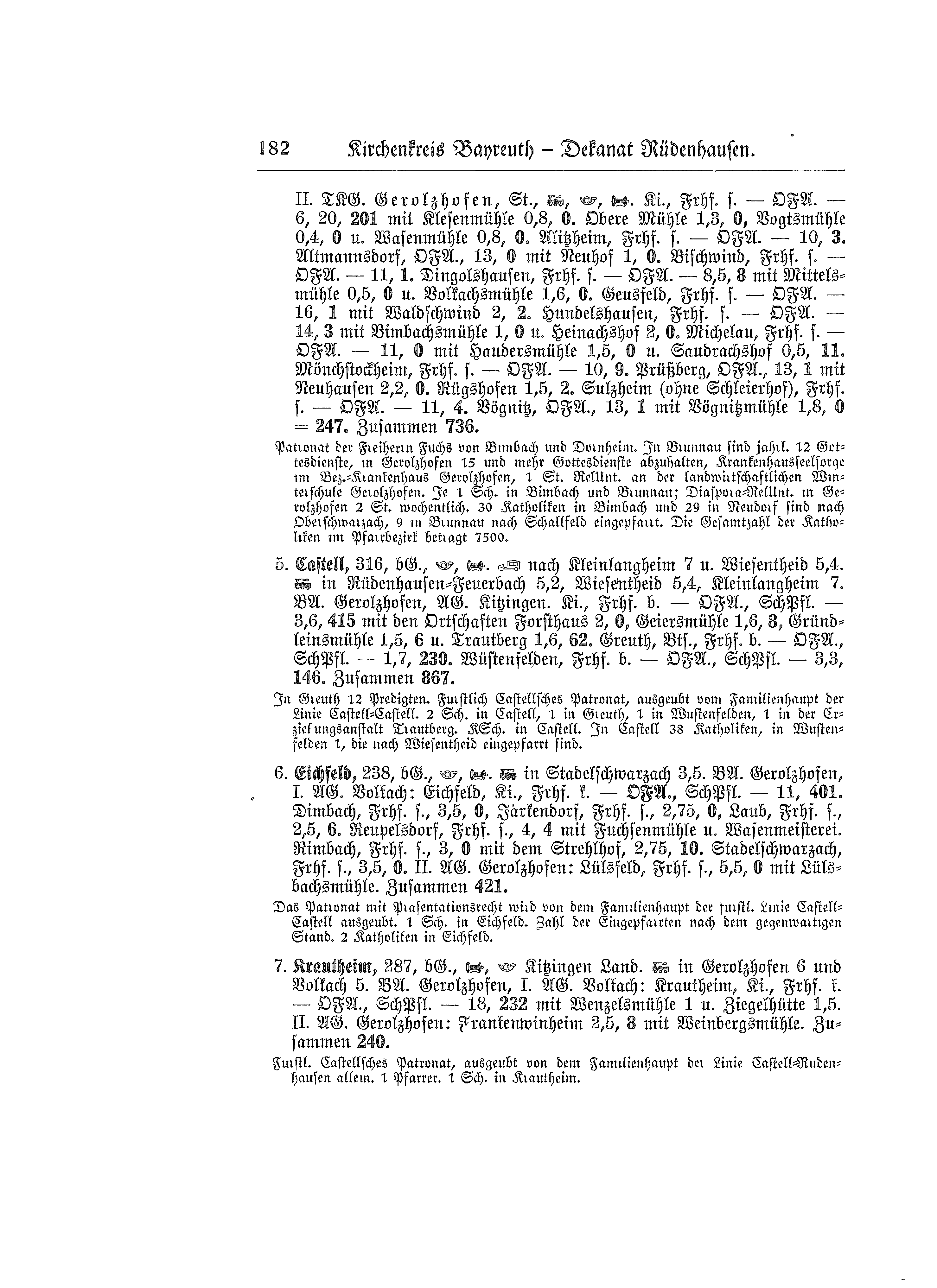 Pfarrhaus sehr alt, Baufonds gegründet. Fürstlich Castellsches Patronat ausgeübt vom Familienhaupt der Linie Castell-Rüdenhausen. 2 Schulen (2 Lehrkräfte), Religionsunterricht in Wiesentheid (4) wöchentlich 1 Stunde. Gemeindediakonie und Kinderschule. Andersgläubige in Rüdenhausen 9, in Wiesentheid 1120.