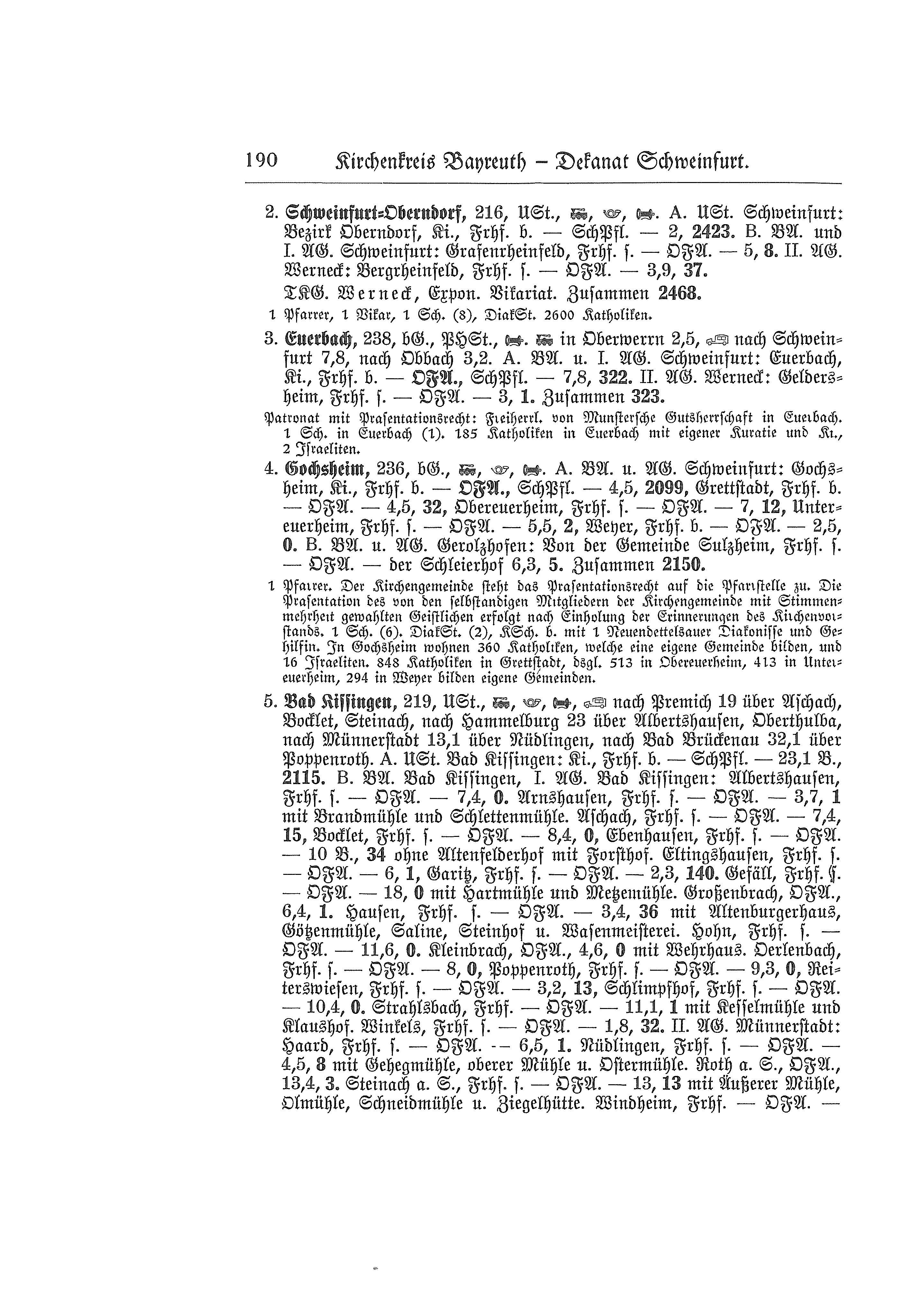 225 m, Unmittelbare Stadt, Bahn, Post, Telefon, Bus zum Hauptbahnhof, Autoverbindnng über Mainberg, Schonungen, Marktsteinach nach Aidhausen 25 km, nach Obbach 12 km, über Oberndorf nach Hirschfeld 14 km, über Deutschhof, Stadtlauringen nach Sulzfeld 27 km, über Schwebheim nach Volkach 27,8 km. A. Unmittelbare Stadt Schweinfurt ohne Oberndorf mit Deutschhof 4 km, 4 Seeln, Werrnmühle oder Bellevue 3 km, 4 Seelen, 2 Kirchen, Friedhof bürgerlich - Schulpflegschaft - 13.659 Seelen. B. Bezirksamt und Amtsgericht Schweinfurt: Dittelbrunn, Friedhof bürgerlich - Ortsfürsorgeausschuß - 3,8 km, 10 Seelen, Forst, Friedhof simultan - Ortsfürsorgeausschuß - 8,5 km, 1 Seelen, Hambach, Friedhof simultan - Ortsfürsorgeausschuß - 7 km, 0 Seelen, Hausen, Friedhof simultan - Ortsfürsorgeausschuß - 8 km, 12 Seelen, Löffelsterz, Friedhof simultan - Ortsfürsorgeausschuß - 13,5 km, 0 Seelen, Maibach, Friedhof bürgerlich - Ortsfürsorgeausschuß - 7,5 km, 7 Seelen, Mainberg, Betsaal, Predigtstation, Friedhof bürgerlich - Ortsfürsorgeausschuß - 4,5 km, 32 Seelen, Marktsteinach, Friedhof bürgerlich - Ortsfürsorgeausschuß - 10 km, 4 Seelen, Schonungen ohne Reichelshof, Unterrichtsstation, Friedhof bürgerlich - Ortsfürsorgeausschuß - 5,8 km, 150 Seelen mit Kaltenhof, Waldsachsen, Friedhof bürgerlich - Ortsfürsorgeausschuß - 12,5 km, 1 Seelen mit Bayerhof, Predigtstation im Schloß, 13,5 km, 52 Seelen. Bezirksamt und Amtsgericht Haßfurt: Gädheim, Friedhof simultan - Ortsfürsorgeausschuß - 10,5 km, 2 Seelen, Greßhausen, Friedhof simultan - Ortsfürsorgeausschuß - 14,5 km, 0 Seelen, Ottendorf, Friedhof simultan - Ortsfürsorgeausschuß - 13,5 km, 0 Seelen. Zusammen 13.902 Seelen.
