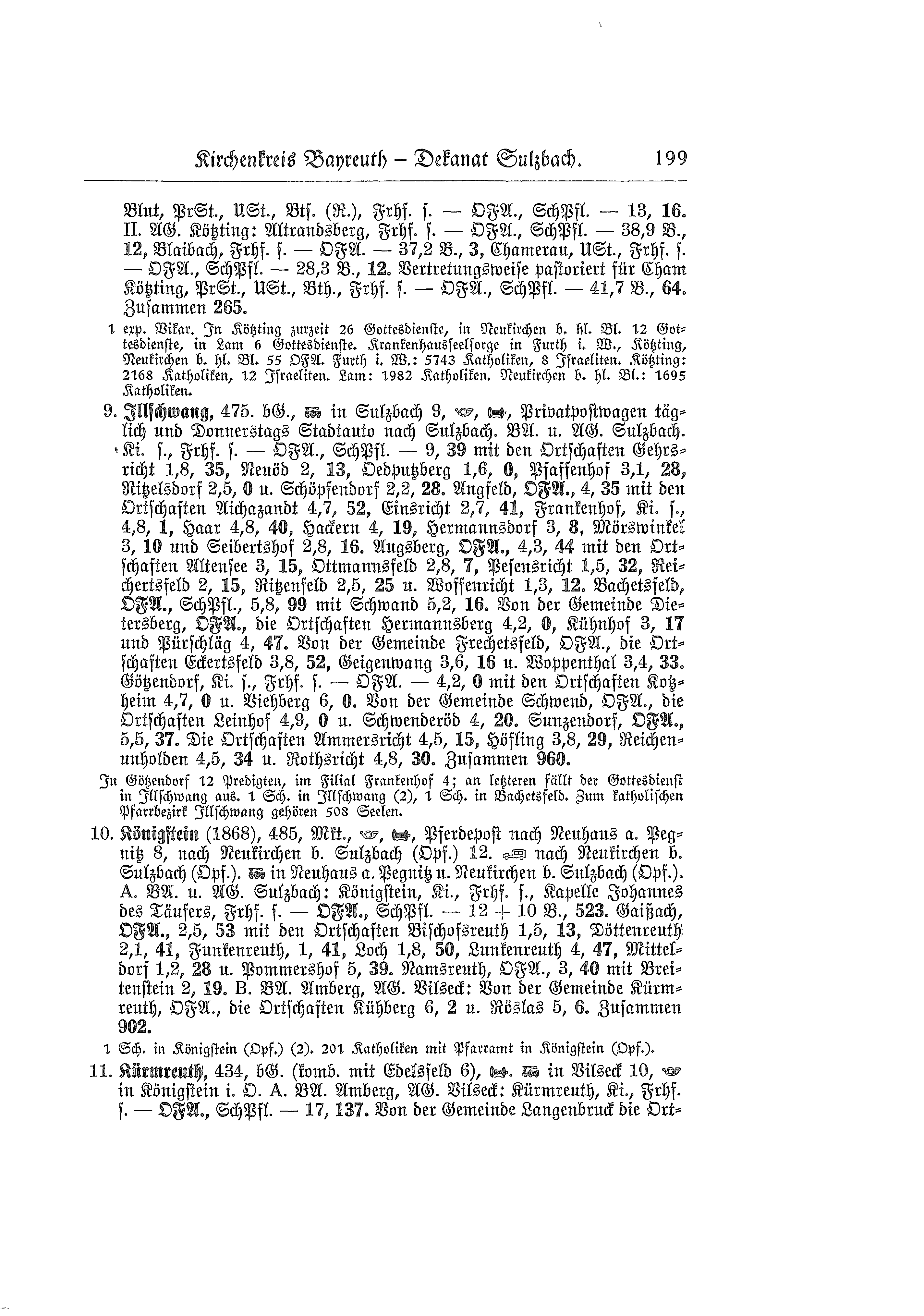 490 m, bürgerliche Gemeinde, Posthilfsstation Bahn und Post in Hartmannshof 7,5 km, Bus in Claramühle 2,5 km (nach Hersbruck). A. Bezirksamt und Amtsgericht Sulzbach i. O.: Fürnried, Kirche, simultan - Ortsfürsorgeausschuß (Pfarrer Vorsitz), Schulpflegschaft - 7,5 km + 18 Bahnkilometer, 178 Seelen mit den Ortschaften Ammerried 2 km, 17 Seelen, Hofstetten 1,5, 21, Kutschendorf 3 km, 16 Seelen, Lichtenegg 3 km, 53 Seelen, Tannlohe 2,5 km, 14 Seelen und Wurmrausch 1 km, 28 Seelen. Eckeltshof, Ortsfürsorgeausschuß (Pfarrer Vorsitz), 3,5 km, 64 Seelen mit den Ortschaften Buchhof 2,5 km, 22 Seelen, Pleishof 2,5 km, 11 Seelen, Troßalter 2 km, 32 Seelen und Wolfertsfeld 4 km, 55 Seelen ohne Kegelheim. Frechetsfeld, Ortsfürsorgeausschuß (Pfarrer Vorsitz), 2,5 km, 124 Seelen mit Burkartshof 4,5 km, 11 Seelen ohne Eckertsfeld, Geigenwang, Haslach und Woppental. Poppberg, Ortsfürsorgeausschuß (Pfarrer Vorsitz), Schulpflegschaft, 5 km, 80 Seelen mit den Ortschaften Gronatshof 6 km, 59 Seelen, Hainfeld 4 km, 45 Seelen, Matzenhof 7 km, 64 Seelen ohne Odammershüll. Schwend, Ortsfürsorgeausschuß (Pfarrer Vorsitz), Schulpflegschaft, 5,5 km, 129 Seelen mit den Ortschaften Aicha 7,5 km, 96 Seelen, Baumgarten 6 km, 16 Seelen, Betzenberg 7,5 km, 98 Seelen, Dickatshof 6,5 km, 17 Seelen, Hirschricht 5 km, 27 Seelen, Leinberg 6 km, 7 Seelen, Oedhaag 8 km, 43 Seelen, Oedthal 7,5 km, 8 Seelen, Riedelhof 6 km, 95 Seelen ohne Leinhof und Schwenderöd. Von der Gemeinde Sunzendorf die Ortschaften Dollmannsberg 2 km, 29 Seelen und Nonnhof 2 km, 37 Seelen. B. Bezirksamt und Amtsgericht Hersbruck (Mittelfranken): Heldmannsberg, Ortsfürsorgeausschuß (Pfarrer Vorsitz), 3 km, 61 Seelen mit Willersdorf 1,5 km, 47 Seelen ohne Clara- und Regelsmühle. Von der Gemeinde Alfeld die Kirchtalmühle 2,5 km, 7 Seelen. Zusammen 1.611 Seelen.