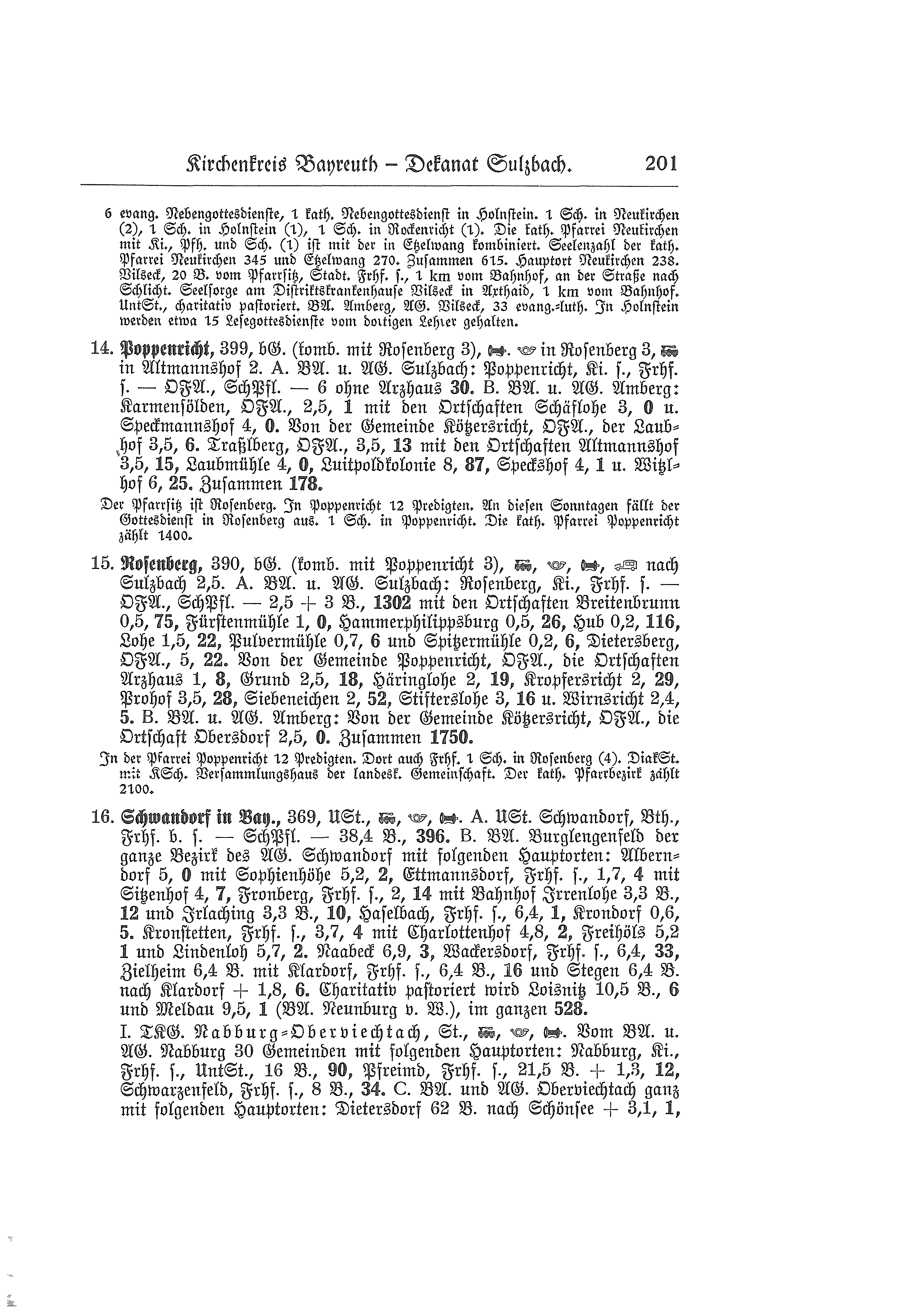 451 m (620), bürgerliche Gemeinde, Bahn, Post, Telefon, Postwagen nach Holnstein-Eschenfelden 7 km, Bus nach Holnstein-Königstein 17 km. Bezirksamt und Amtsgericht Sulzbach i. Opf. Kirche, Friedhof simultan - Ortsfürsorgeausschuß, Schulpflegschaft - 442 Seelen mit den Ortschaften Fichtenhof 1 km, 63 Seelen und Peilstein 1,5 km, 50 Seelen. Von der Gemeinde Bachetsfeld, Ortsfürsorgeausschuß, Schulpflegschaft, die Ortschaften Büchelberg 4,5 km, 69 Seelen, Ermhof 2,5 km, 26 Seelen, Fichtelbrunn 4,2 km, 15 Seelen, Haid 3,5 km, 30 Seelen, Pilgramshof 3,5 km, 14 Seelen. Holnstein, Friedhof konfessionell evangelisch - Ortsfürsorgeausschuß, Schulpflegschaft - Gottesdienstl. Raum 3,5 km, 139 Seelen mit Haghof 3,6 km, 24 Seelen, Högberg 5 km, 11 Seelen, Hundsboden 3,5 km, 21 Seelen und Oberreinbach 3,5 km, 122 Seelen. Von der Gemeinde Mittelreinbach, Ortsfürsorgeausschuß, die Ortschaften Föderricht 2,5 km, 8 Seelen, Grasberg 2 km, 36 Seelen und Waldlust 2 km, 5 Seelen. Röckenricht, Ortsfürsorgeausschuß, Schulpflegschaft, Bahn 4,8 km, 68 Seelen mit den Ortschaften Eckenricht 5,2 km, 51 Seelen, Einzelhof 5 km, 7 Seelen, Fromberg 5,5 km, 73 Seelen, Habres 5 km, 1 Seelen, Lockenricht 2,8 km, 77 Seelen, Niederricht 5,5 km, 85 Seelen und Pfeilstein 4,5 km, 15 Seelen. Trondorf, Ortsfürsorgeausschuß, 4 km, 38 Seelen mit den Ortschaften Hundheim 4,5 km, 21 Seelen, Obermainshof 4 km, 15 Seelen, Schönlind 2,8 km, 39 Seelen, Truisdorf 2,8 km, 35 Seelen und Untermainshof 4,5 km, 25 Seelen. Zusammen 1.523 Seelen.