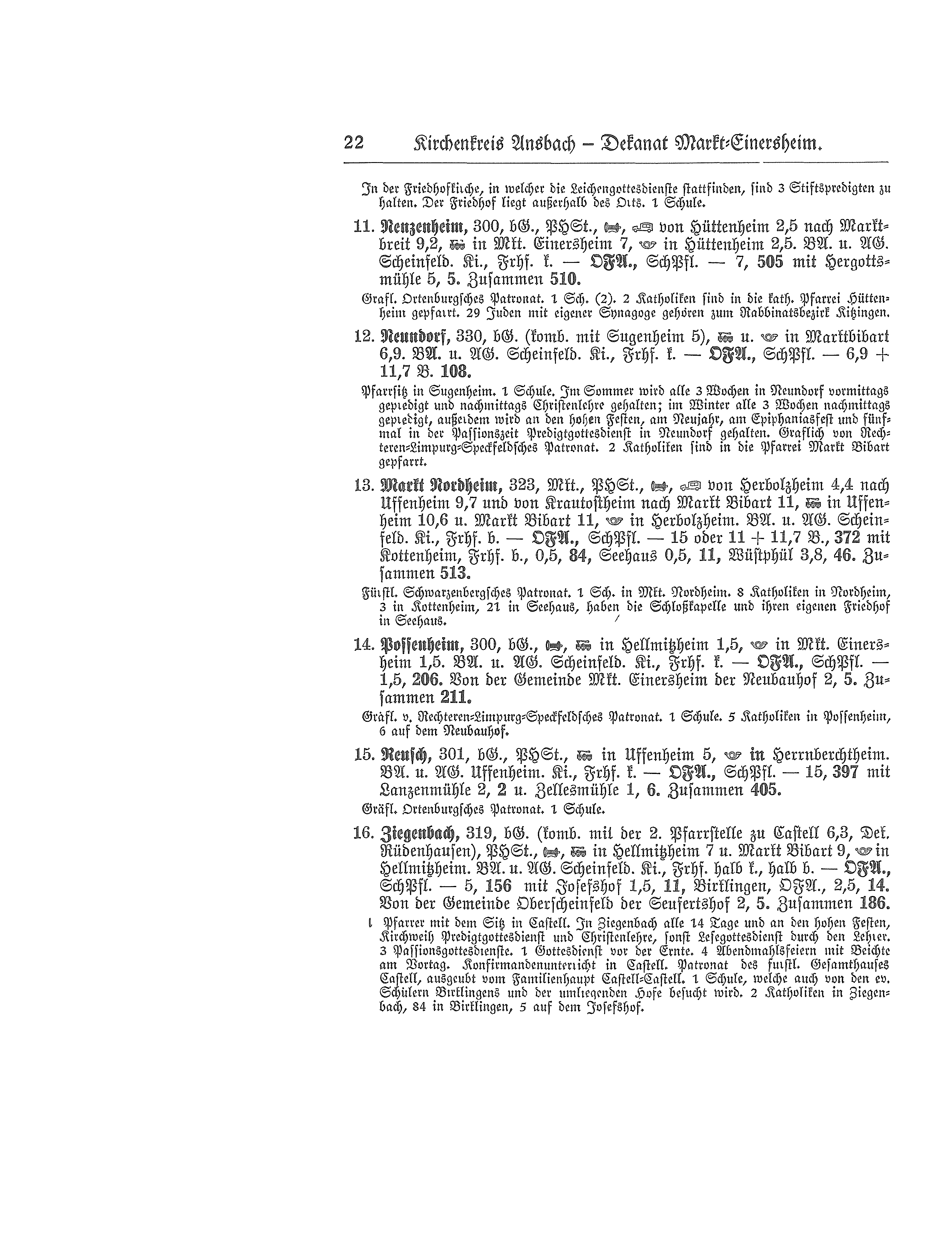282 m, bürgerliche Gemeinde, Posthilfsstation, Telefon, Bahn und Post in Markt Einersheim 3,9 km. Bezirksamt und Amtsgericht Scheinfeld. 2 Kirchen, Friedhof bürgerlich - Ortsfürsorgeausschuß (Pfarrer Vorsitz), Schulpflegschaft - 3,9 km, 272 Seelen mit Nierenmühle 2 km, 5 Seelen und Schwarzmühle 0,5 km, 7 Seelen. Zusammen 284 Seelen.