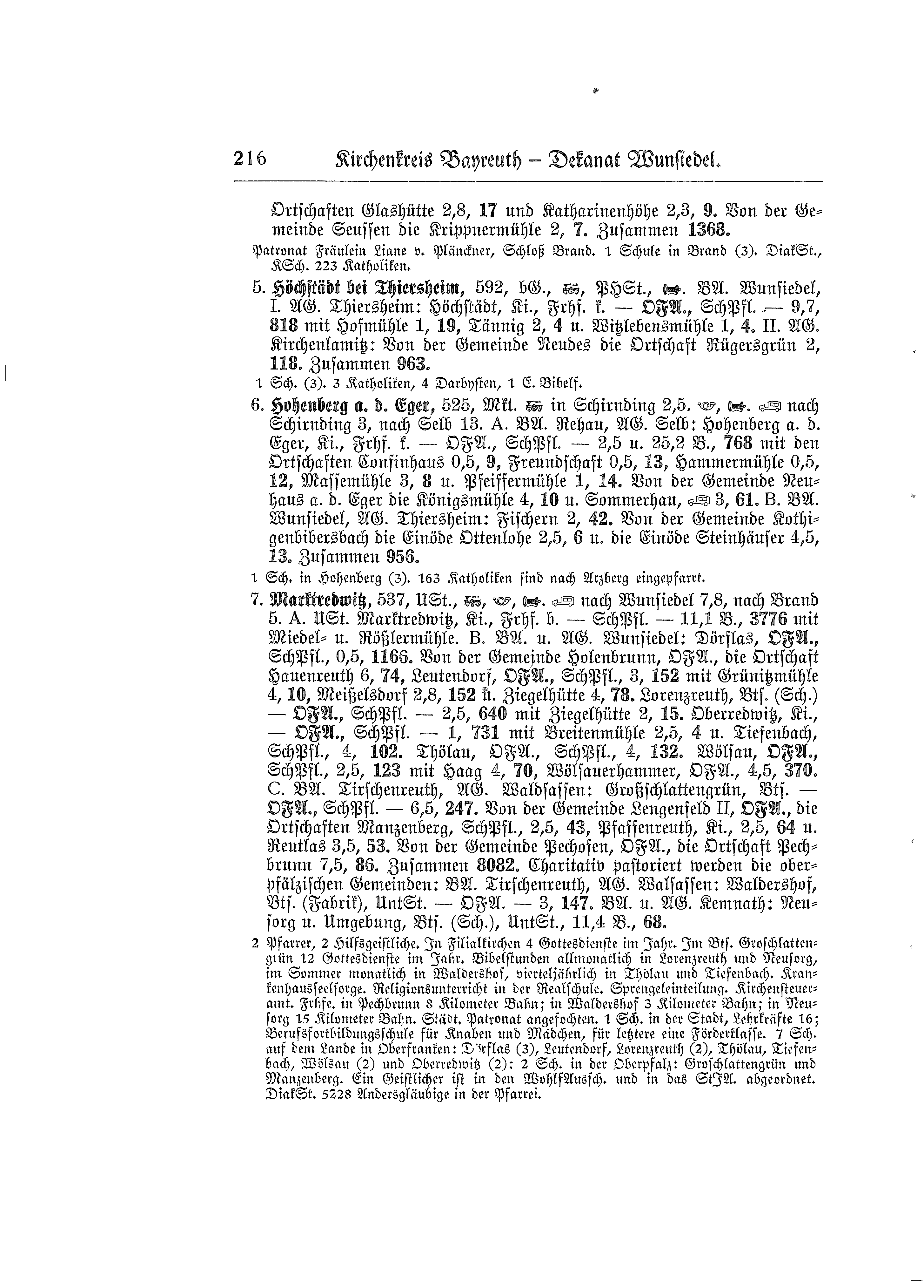 477 m, Stadt, Post, Telefon, Bus nach Waldsassen 13 km. Bezirksamt Wunsiedel, Amtsgericht Thiersheim. Kirche, Friedhof konfessionell evangelisch - Ortsfürsorgeausschuß, Schulpflegschaft - 21,8 Bahnkilometer, 3.394 Seelen, Bergnersreuth, Ortsfürsorgeausschuß, Schulpflegschaft, 2,5 km, 222 Seelen. Von der Gemeinde Fischern die Ortschaften Forellenmühle 2,5 km, 8 Seelen und Oschwitz 2,5 km, 105 Seelen. Grafenreuth, Ortsfürsorgeausschuß, Schulpflegschaft, 5,5 km, 164 Seelen mit den Ortschaften Garmersreuth 3,5 km, 49 Seelen, Grafenstein 6 km, 0 Seelen und Leutenberg 6,5 km, 71 Seelen. Haid, Ortsfürsorgeausschuß, 4,5 km, 104 Seelen mit den Ortschaften Hagenhaus 3,5 km, 6 Seelen, Heiligenfurt, Schulpflegschaft, 3 km, 26 Seelen, Klausen 3,5 km, 6 Seelen, Preisdorf 7,5 km, 50 Seelen, Theresienfeld 2,5 km, 10 Seelen und Treue Freundschaft 4 km, 5 Seelen. Korbersdorf 5,5 km, 75 Seelen. Kothigenbibersbach ohne Ottenlohe und Steinhäuser, Ortsfürsorgeausschuß, 4 km, 124 Seelen mit den Ortschaften Dietersgrün 2,8 km, 61 Seelen, Karlmühle 3,7 km, 7 Seelen, Raithenbach mit Ziegelhütte 4 km, 57 Seelen, Rosenbühl 3 km, 15 Seelen und Weidighaus 3,5 km, 6 Seelen. Röthenbach, Ortsfürsorgeausschuß, Schulpflegschaft, 2 km, 593 Seelen mit den Ortschaften Bodenhaus 1,5 km, 7 Seelen, Elisenfels 2 km, 144 Seelen, Märzenhaus 1,5 km, 13 Seelen, Sandmühle 2,5 km, 51 Seelen und Schäferei 2,5 km, 9 Seelen. Schlottenhof, Ortsfürsorgeausschuß, Schulpflegschaft, 1 km, 505 Seelen mit den Ortschaften Kieselmühle 1,5 km, 13 Seele, Schacht 2 km, 40 Seelen und Ziegelhütte 1,5 km, 6 Seelen. Von der Gemeinde Schirnding die Ortschaft Seedorf 6 km, 47 Seelen. Seussen, ohne Krippnermühle, Ortsfürsorgeausschuß, Schulpflegschaft, 4 km, 514 Seelen mit der Dötschenmühle 4,5 km, 7 Seelen und Teichmühle 3,2 km, 10 Seelen. Zusammen 6.524 Seelen.