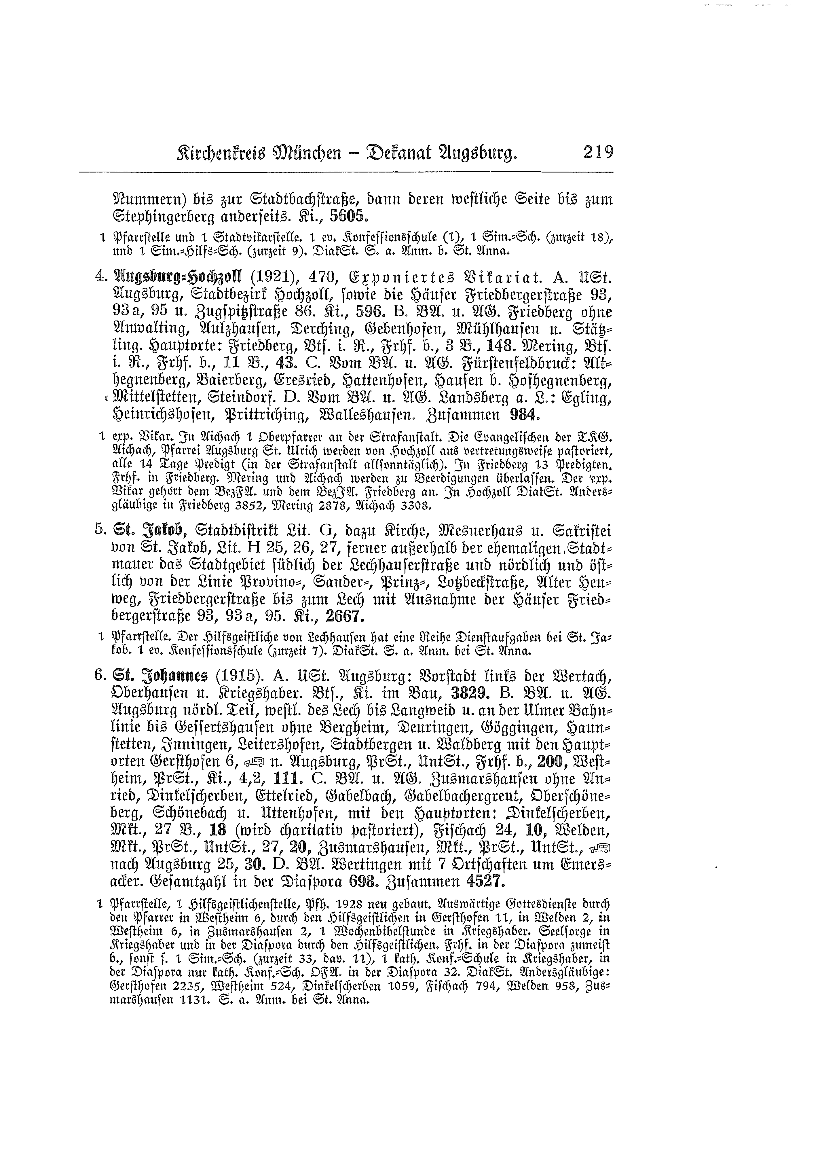 2 Pfarrstellen und 1 Hilfsgeistlichenstelle. Im Betsaal der Servatiuspfründe alle 14 Tage Gottesdienst, ebenso in der Kapelle des Diakonissenhauses (öffentlich), in letzterer durch die beiden Hausgeistlichen. Getrennte Seelsorgesprengel für beide Pfarrer. 1 evangelische Konfessionsschule (zurzeit 14 Lehrkräfte) und 1 Simultanschule (zurzeit 14 Lehrkräfte, davon 5 evangelische). Gemeindediakonie. Anmerkung für den ganzen Stadtbezirk: Auto[bus] (Gersthofen 8 km, Affing 16,7 km, Friedberg 8 km, Königsbrunn 14,6 km, Wertingen 34,8 km, Zusmarshausen 24,6 km), Straßenbahn auch nach Göggingen und Haunstetten. 3 hauptamtliche Religionslehrer für Gymnasium, Oberrealschule und Maria Theresia-Schule samt Handelsschule für Mädchen. Religionsunterricht durch Pfarrgeistliche an Realgymnasium, Handelsschule für Knaben, v. Stettenschem Institut, Handwerkerfachschule und Landwirtschaftsschule. Evangelischer Jugenddienst. Predigerwitwenkasse und Emeritenfonds für die Augsburger Geistlichen. Friedhöfe: 1 evangelischer, 1 katholischer, 3 bürgerliche (1 mit Krematorium). Ein Geistlicher ist in den Wohlfahrtshauptausschuß und in das Stadtjugendamt abgeordnet, jedem der 16 Wohlfahrtsbezirksausschüsse gehört 1 Geistlicher aus einem der beteiligten Pfarrsprengel an. 2 Geistliche sind Mitglieder der Stadtschulpflegschaft, je einer der 6 konfessionellen und 5 gem. Schulpflegschaft, der Schulvorstandschaft und der 3 Schulvertretungen der Berufsfortbildungsschulen. Das Präsentationsrecht für sämtliche zur Gesamtkirchengemeinde gehörigen Pfarrstellen kommt den verstärkten Kirchenvorständen der betreffenden Pfarreien zu. Die Gesamtbevölkerung der Stadt Augsburg 165.522 setzt sich zusammen aus 32.693 Angehörigen der evangelischen Landeskirche, 129.319 Katholiken, 8 Altlutheranern, 8 Mennoniten, 29 Baptisten, 71 Methodisten, 128 Neuapostolischen, 361 Adventisten, 51 sonstigen Evangelischen, 7 Orthodoxen, 178 Altkatholiken, 26 sonstige Christen, 1.203 Israeliten, 1.440 Freireligiösen, Konfessionslosen usw.