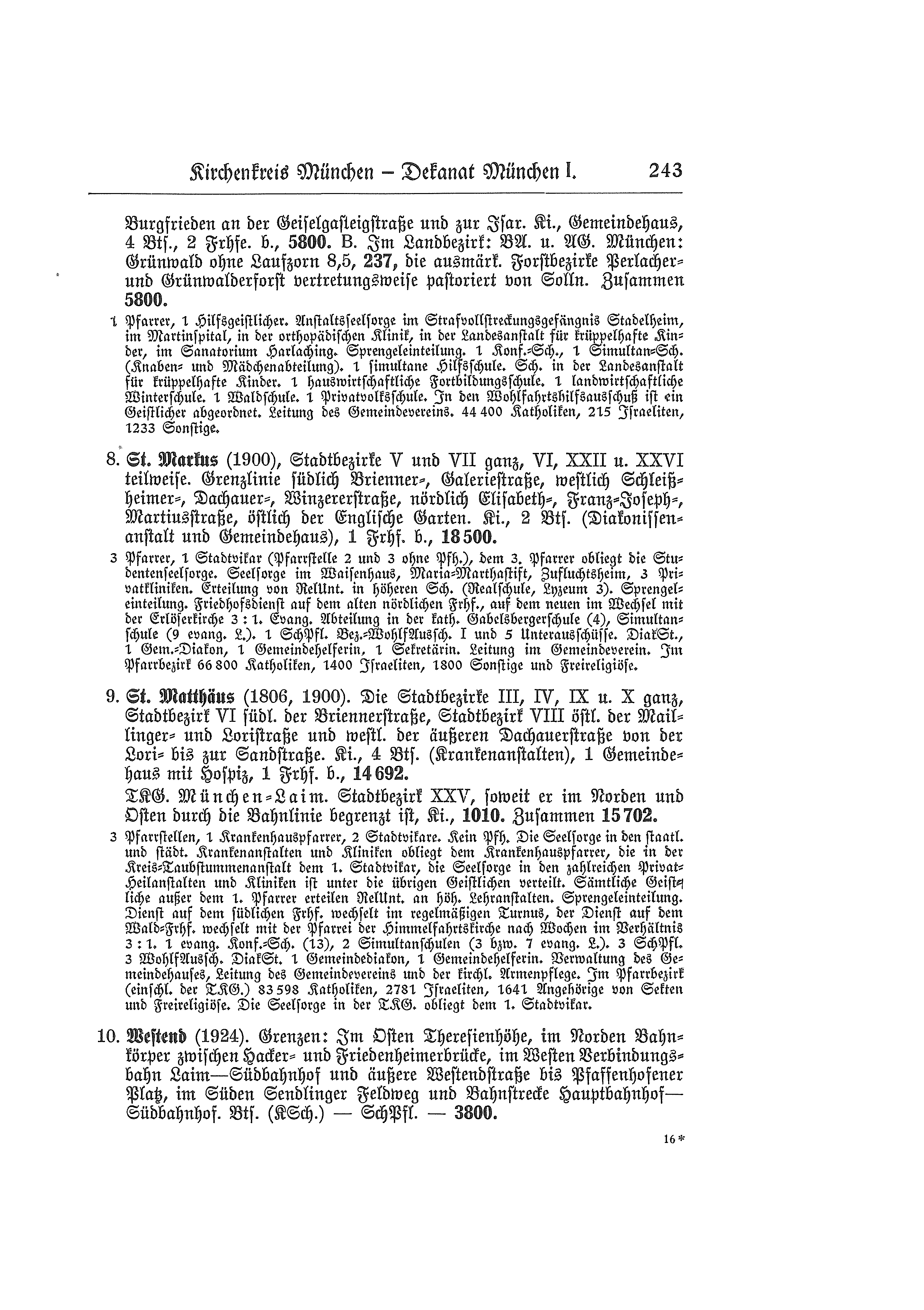 2 Pfarrer, 2 Hilfsgeistliche. und Pfarrhaus für sämtliche Geistliche, den Kirchner und Organisten. Bibelstunde in wochenweisem Wechsel im Konfirmandensaal (1. Pfarrer) und Wittelsbacherschule (2. Pfarrer). Seelsorge im Untersuchungsgefängnis Neudeck (2. Hilfsgeistlicher) und im Untersuchungsgefängnis Corneliusstraße (1. Hilfsgeistlicher). Religionsunterricht im Lehrerinnenseminar (2. Pfarrer), im Mädchenlyzeum Küspert (2. Hilfsgeistlicher), in der Riemerschmidtschen Handelsschule (1. Hilfsgeistlicher) Sprengeleinteilung. 1 Konfessionschule (Herrnstraße), 1 Simultanschule (Klenzestraße). Sämtliche Geistliche sind in Wohlfahrts-, Bezirks- bzw. Unterausschüsse abgeordnet. Gemeindediakonie. Im Gemeindebezirk 79.147 Katholiken, 3.100 Israeliten, 1.777 Sonstige.