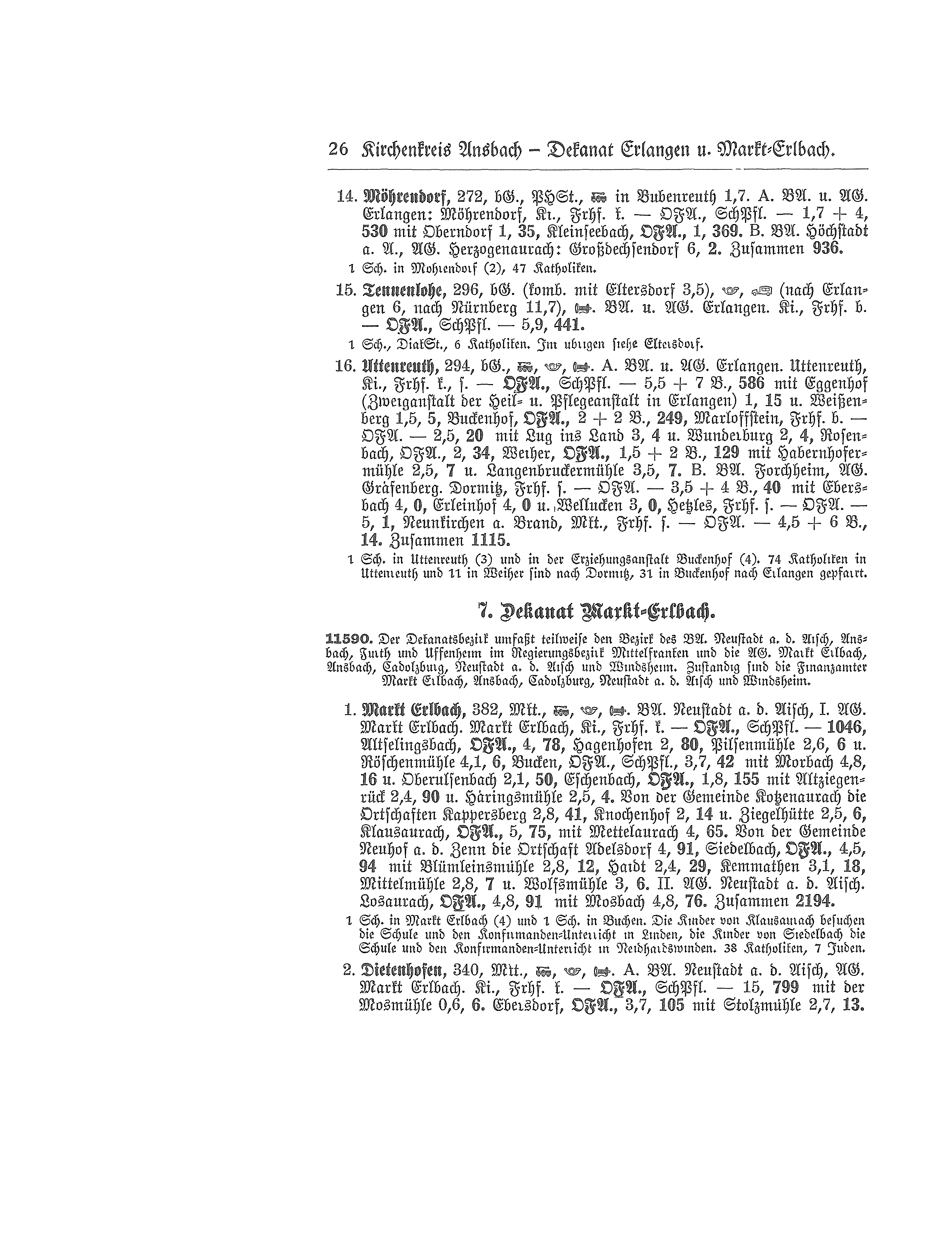 416 m, bürgerliche Gemeinde, Bahn, Post, Telefon. Bezirksamt und Amtsgericht Erlangen. Kirche, Friedhof bürgerlich - Ortsfürsorgeausschuß (Pfarrer Vorsitz), Schulpflegschaft - 12 km, 815 Seelen Gabermühle 3,8 km, 7 Seelen und Käswasser 1,2 km, 79 Seelen, Röckenhof, Ortsfürsorgeausschuß (Pfarrer Vorsitz), 1,8 km, 135 Seelen. Zusammen 1.036 Seelen.