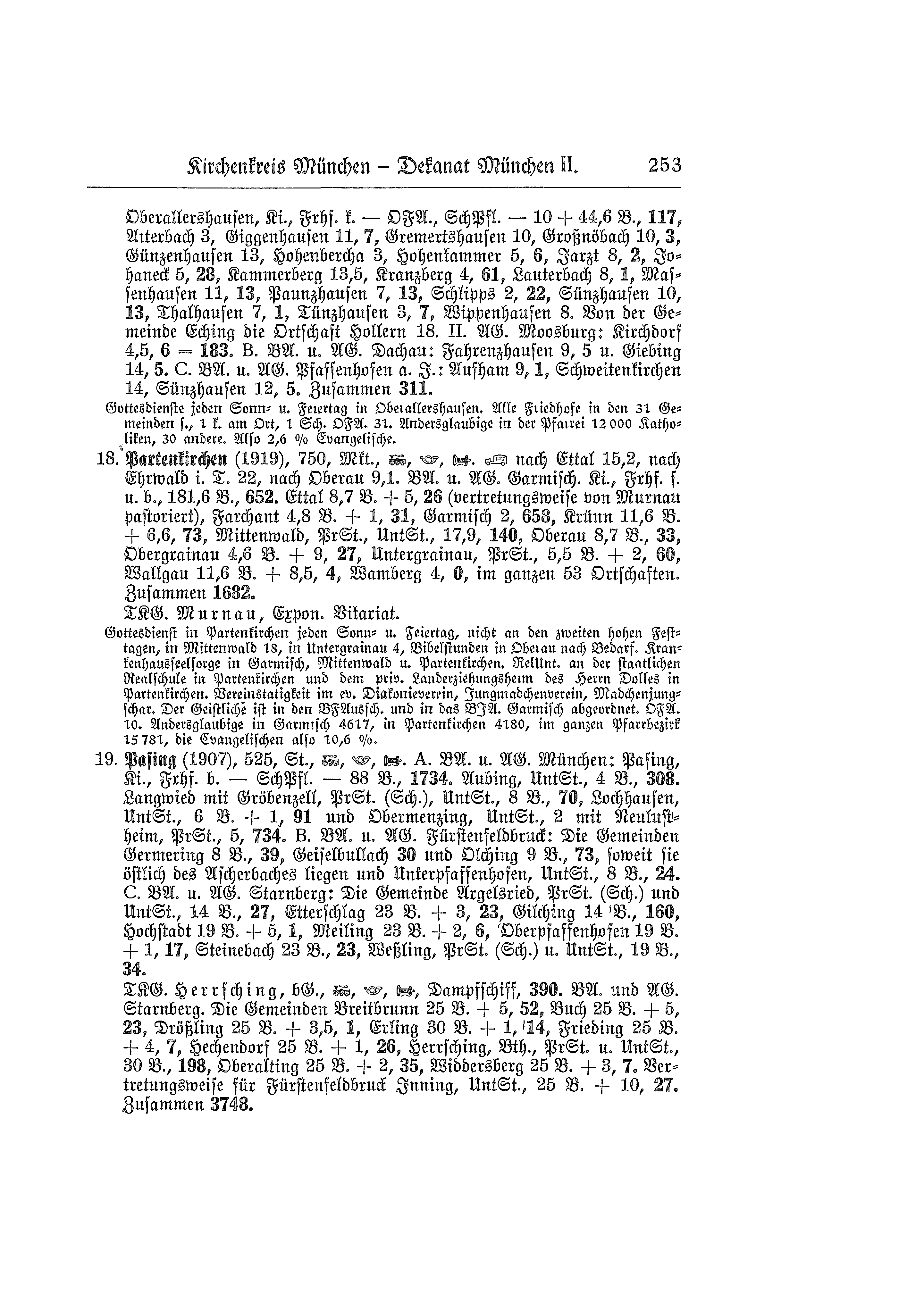 ([seit] 1921), 688 m, Exponiertes Vikariat, Markt, Bahn, Post, Telefon. Bus im Sommer nach Kochel. A. Bezirksamt und Amtsgericht Weilheim: Murnau, Kirche, Friedhof bürgerlich - Ortsfürsorgeausschuß - 155,9 km, 201 Seelen, Aidling, Friedhof simultan, 7 km, 0 Seelen, Eglfing, Friedhof simultan, 7 km, 5 Seelen, Hechendorf, Friedhof simultan, 3,1 km, 2 Seelen, Schöffau 10,5 km, 3 Seelen, Riegsee, Friedhof simultan, 5 km, 5 Seelen, Seehausen, Friedhof bürgerlich, 2 km, 54 Seelen, Spatzenhausen, Friedhof simultan, 5 km, 4 Seelen, Uffing, Unterrichtsstation, Friedhof bürgerlich, 5,6 km, 34 Seelen, Weindorf 1 km, 14 Seelen. B. Bezirksamt und Amtsgericht Garmisch: Die Gemeinden Eschenlohe, Friedhof simultan, 10,5 km, 34 Seelen, Kohlgrub, Predigtstation, Unterrichtsstation, Friedhof simultan, 11,7 km, 36 Seelen, Oberammergau, Kirche, Predigtstation, Unterrichtsstation, Friedhof simultan, 23,8 km, 127 Seelen, Ohlstadt, Friedhof simultan, 6,2 km, 36 Seelen, Saulgrub, Friedhof simultan, 14,3 km, 7 Seelen. Schwaigen mit Lindenhof, Predigtstation, Unterrichtsstation, 5,5 km, 24 Seelen, Unterammergau, Friedhof simultan, 20,5 km, 3 Seelen. Vertretnngsweise wird pastoriert Ettal, Friedhof simultan, 17,1 km + 6,1 km, 26 Seelen. Bezirksamt und Amtsgericht Schongau: Die Gemeinden Bayersoien, Friedhof simultan, 14,3 Bahnkilometer + 4,2 km, Schönberg, Friedhof simultan, 14,3 Bahnkilometer + 8 km, 0 Seelen. Zusammen 631 Seelen.