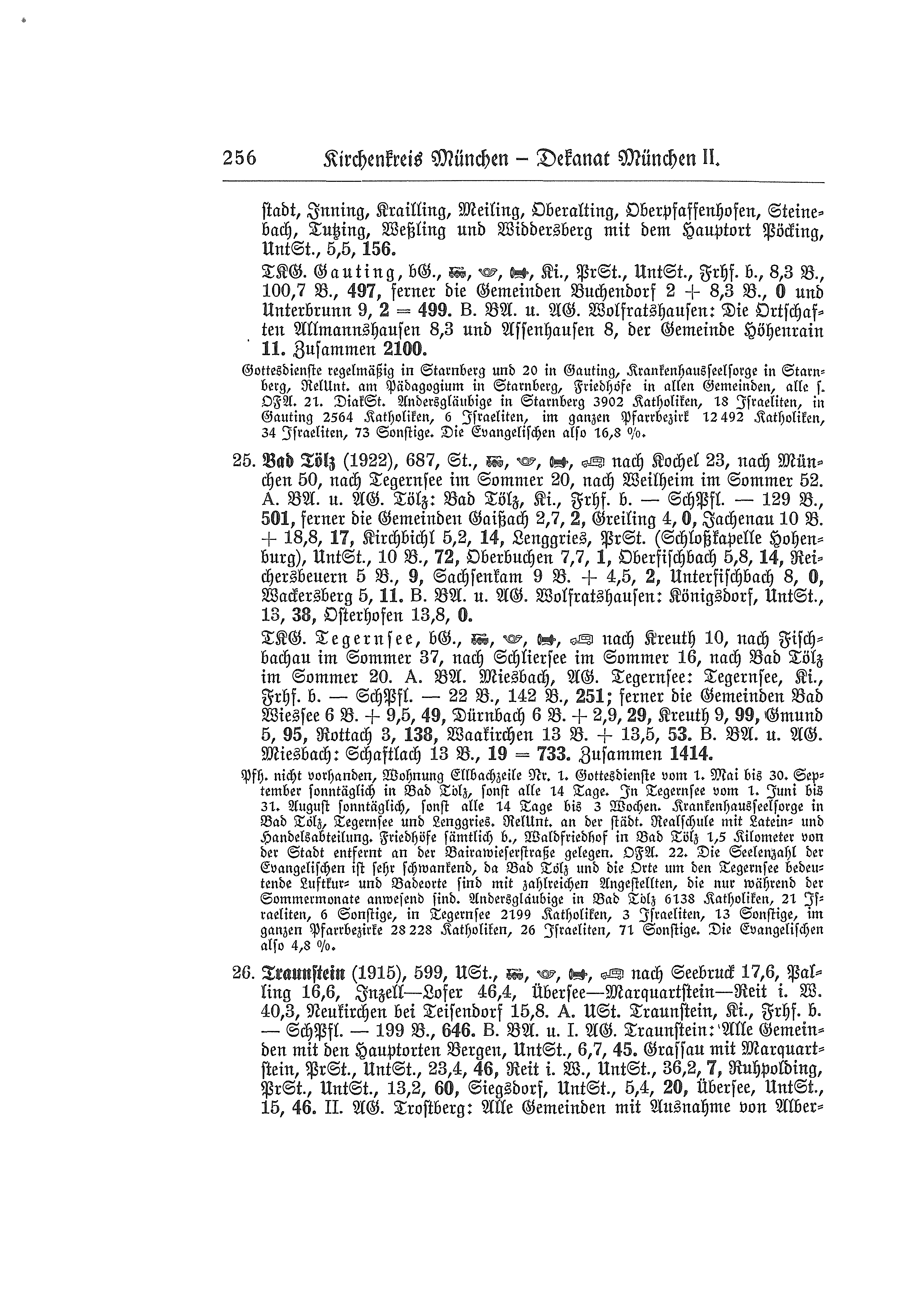 ([seit] 1911), 586 m, Stadt, Bahn, Post, Telefon, Bus nach Erling 15 km, nach Ammerland 37,6 km, nach Wolfratshausen-Sauerlach 37,8 km. A. Bezirksamt und Amtsgericht Starnberg: Starnberg, Kirche, Friedhof bürgerlich, 109 Bahnkilometer, 886 Seelen. Die Gemeinden des Bezirksamts und Amtsgerichts Starnberg ohne Argelsried, Breitbrunn, Buch, Droeßling, Erling, Etterschlag, Frieding, Gilching, Hechendorf, Herrsching, Hochstadt,